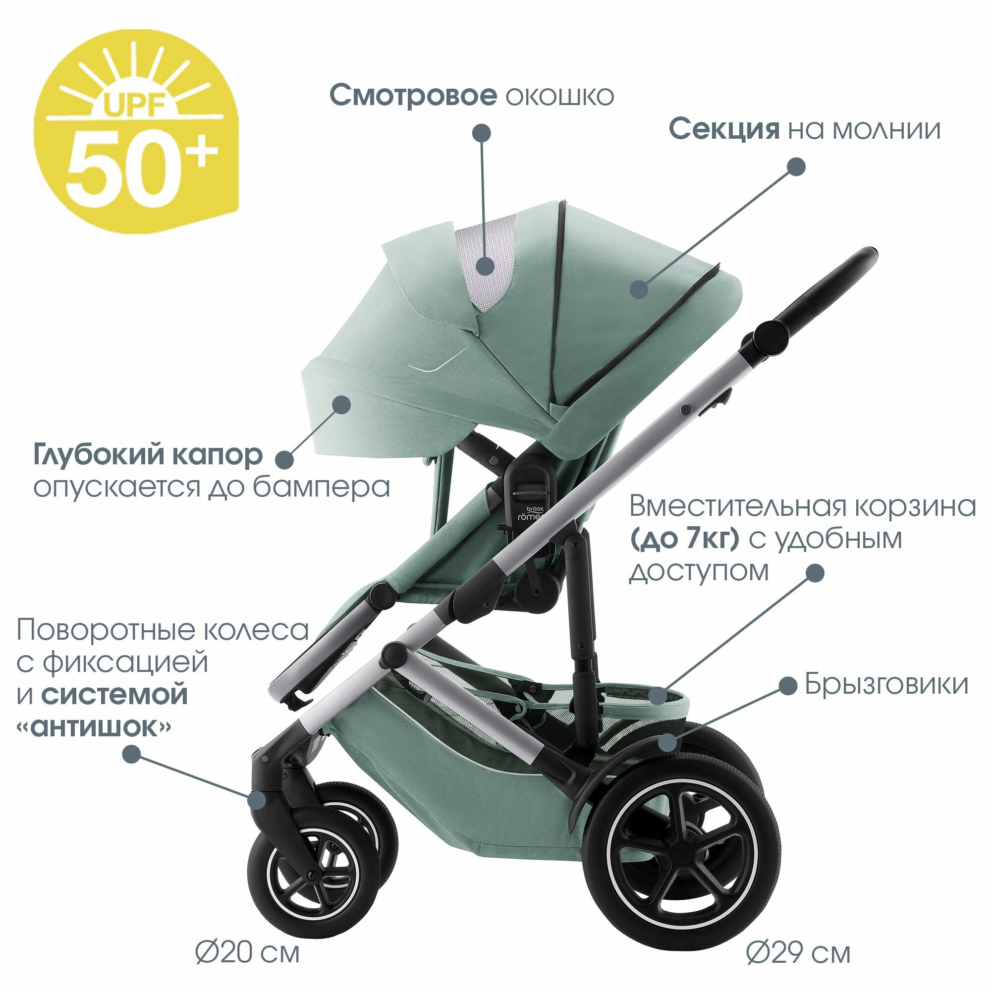 | Капюшон | вентиляция, капюшон опускается до бампера, материал с УФ-защитой, смотровое окно |