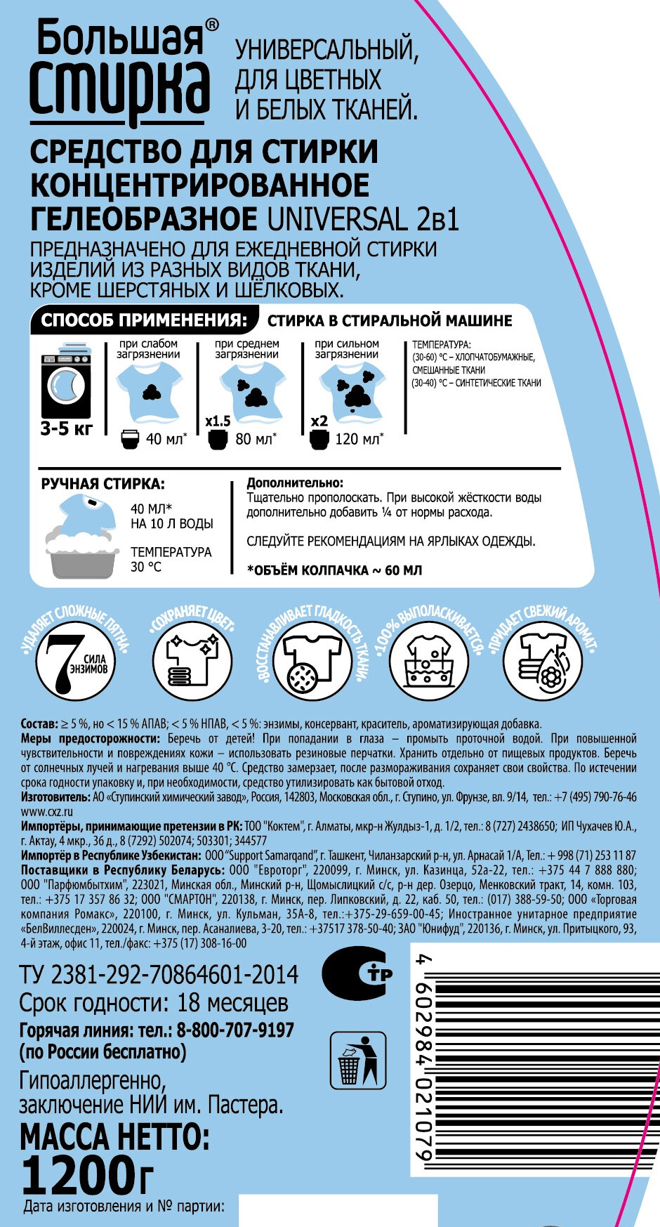 Большая стирка Гель для стирки UNIVERSAL 2в1, 1200 г