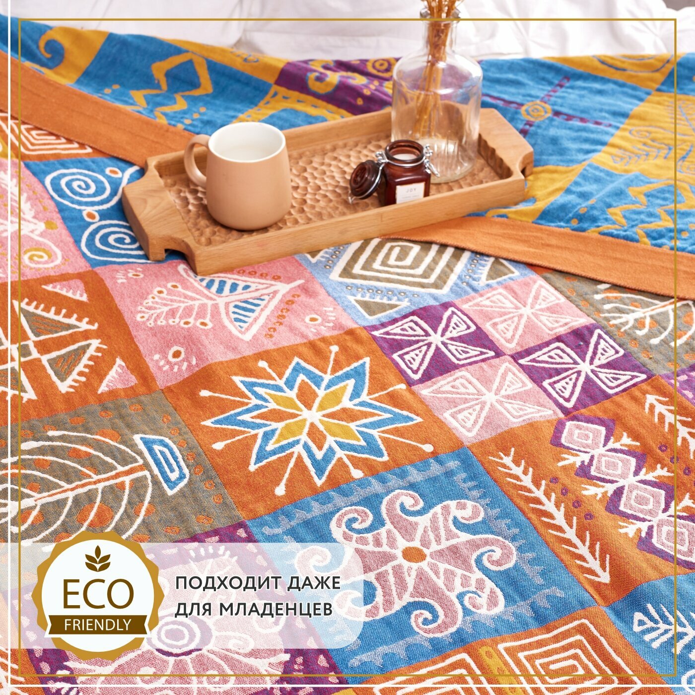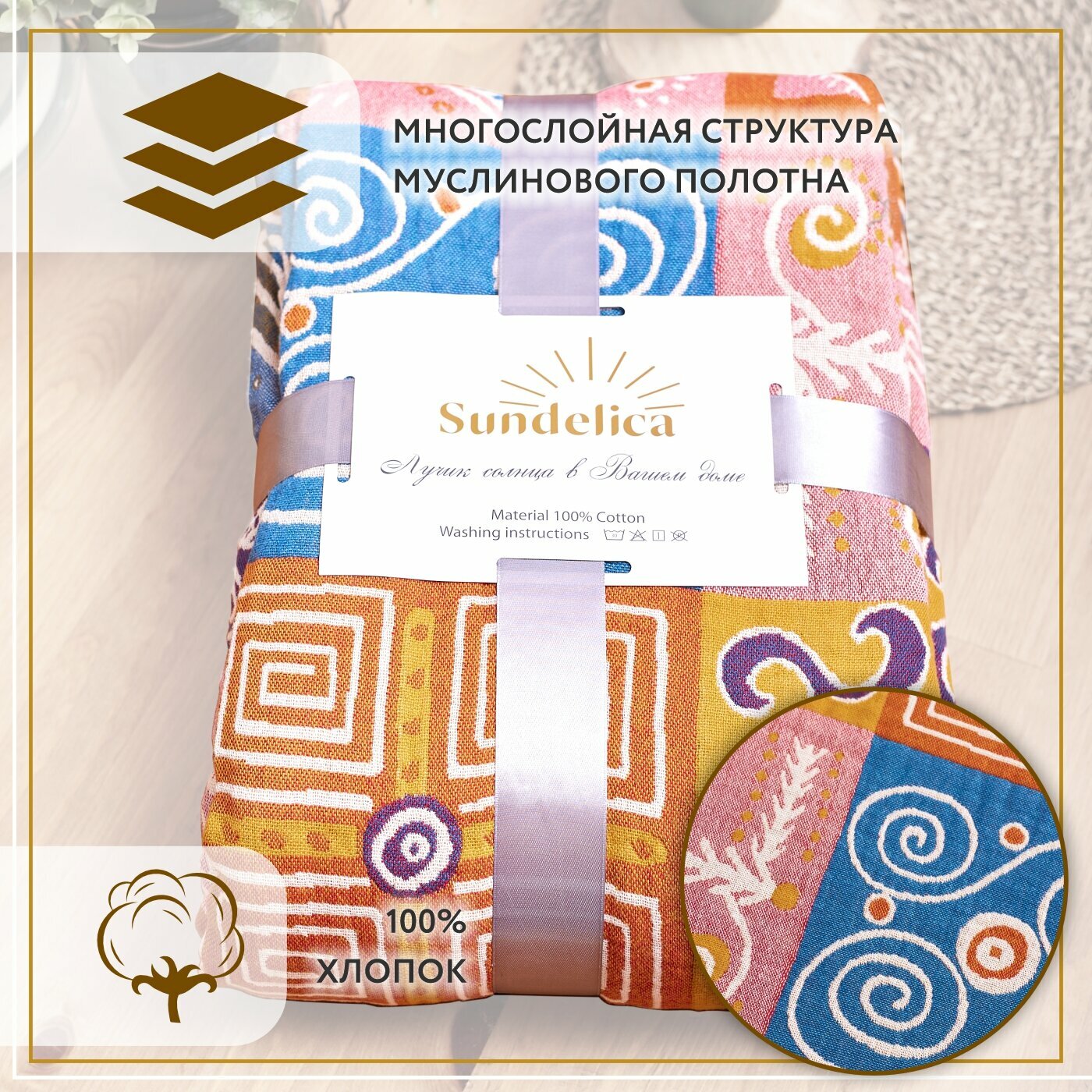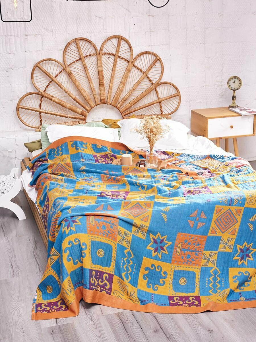 Покрывало на кровать Sundelica Плед 230х250 см "Солнечный орнамент" Хлопок Муслиновое одеяло
