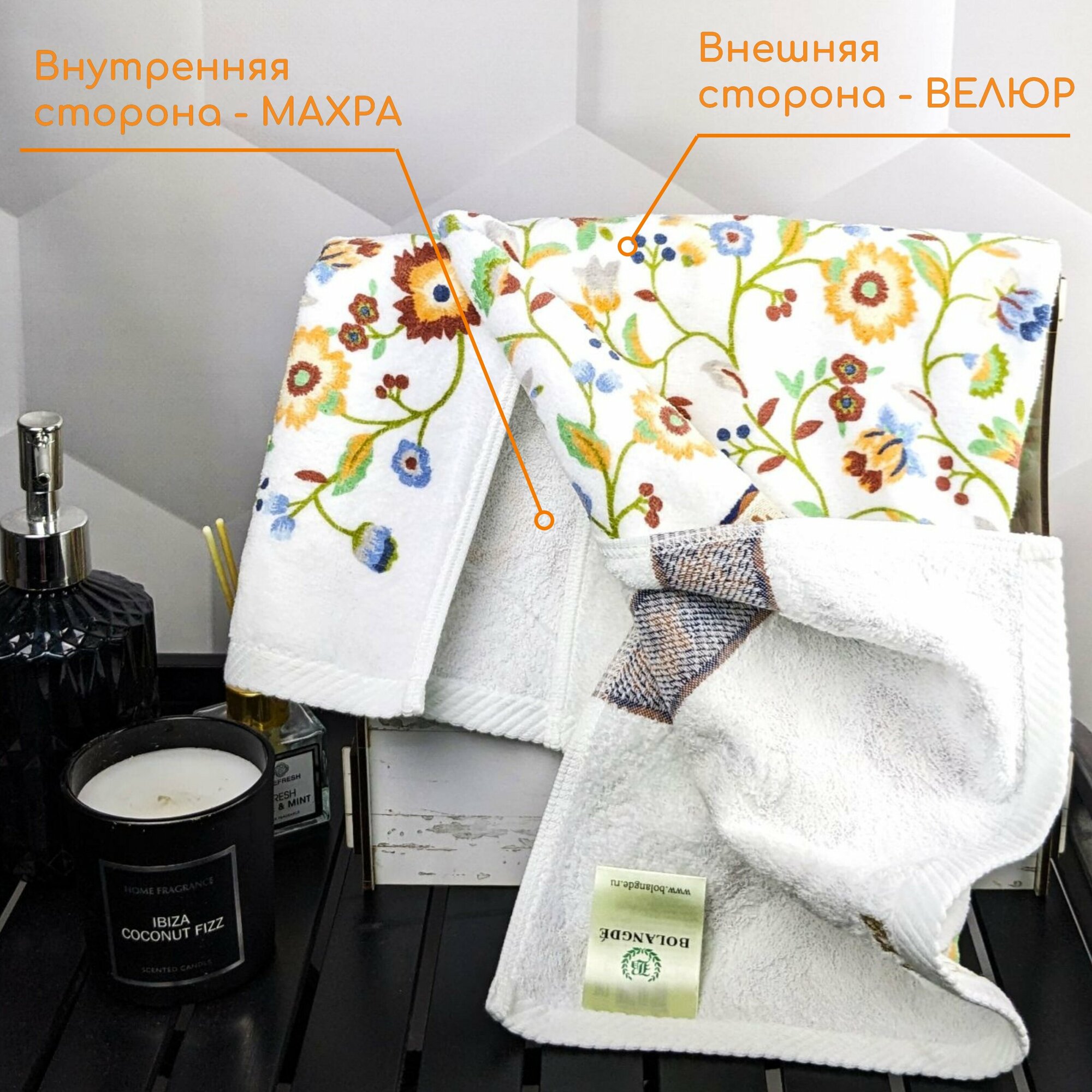 Полотенце для ванной махровое, для лица и рук, велюровое BOLANGDE, 100% хлопок, рисунок цветы, Япония Васильки 50х90, белый/оранжевый/зеленый 1 шт