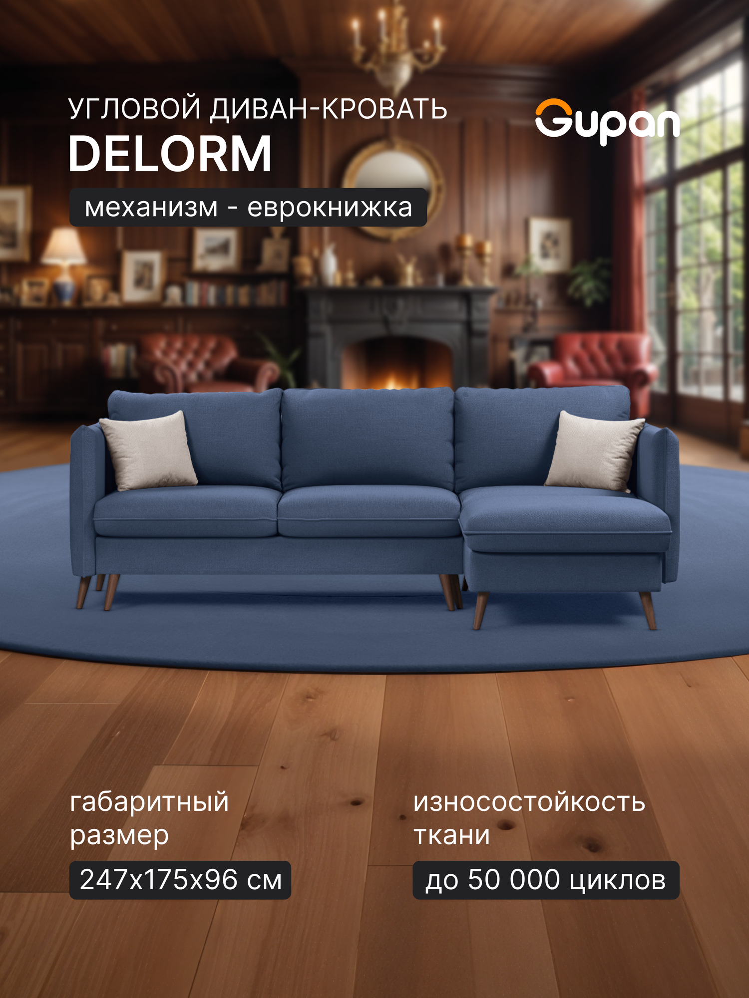 Диван угловой Делорм Navy, диван еврокнижка, 257х175х96, синий, с ящиком для белья, угловой в гостиную, лофт