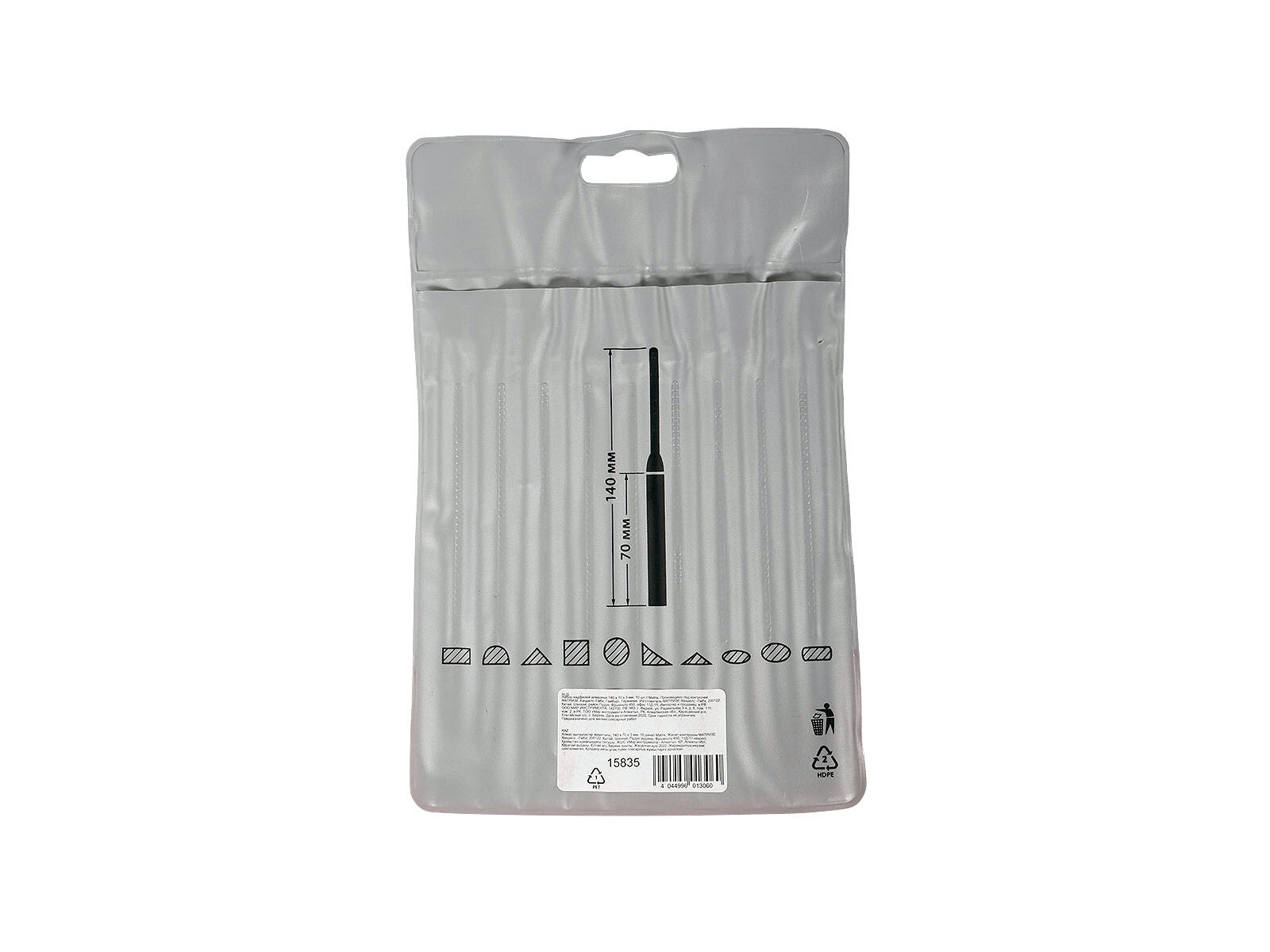 | Подробная комплектация | 10 надфилей: с треугольным (3 вида), прямоугольным (2 вида), круглым, квадратным, овальным (2 вида) и полукруглым сечением. |