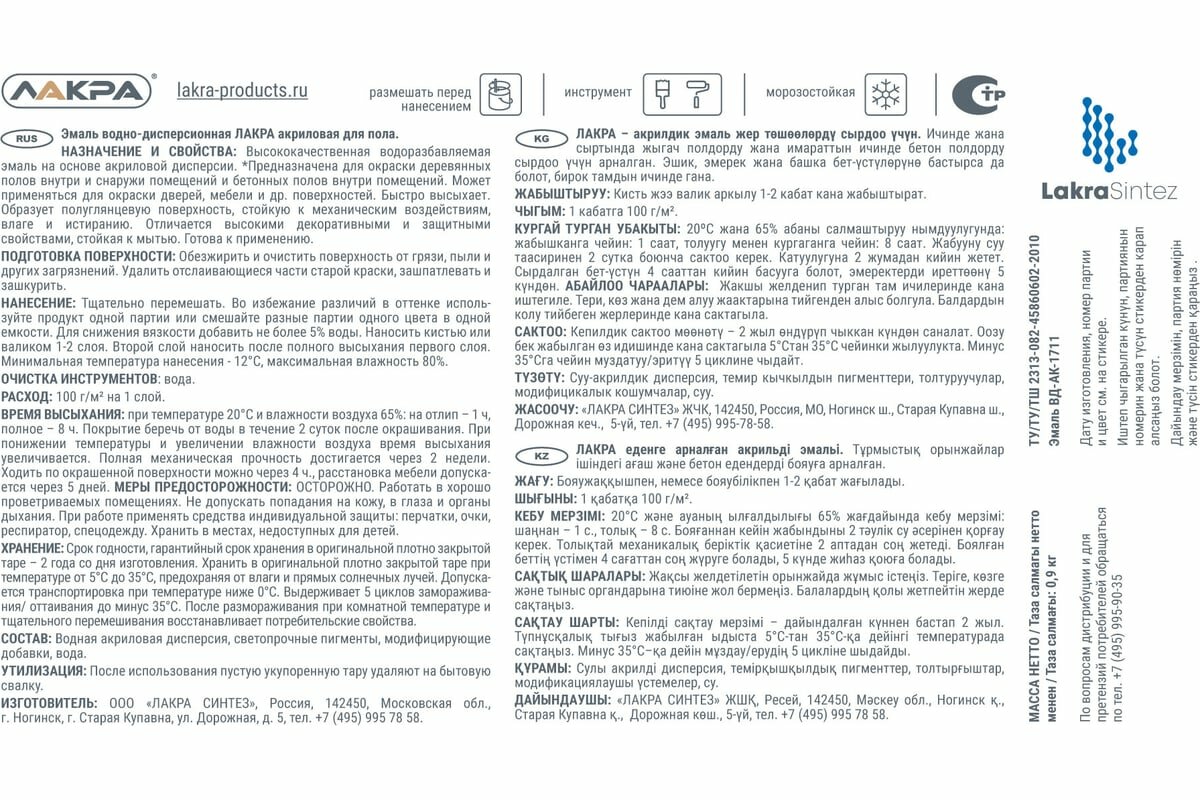 | Дополнительная информация | Высококачественная водоразбавляемая эмаль на основе акриловой дисперсии. Быстро высыхает. Образует полуглянцевую поверхность, стойкую к механическим воздействиям, влаге и истиранию. Отличается высокими декоративными и защитными свойствами, стойкая к мытью. Готова к применению.Применяется для окраски деревянных полов внутри и снаружи помещений, бетонных полов внутри бытовых помещений. Может применяться для окраски дверей, мебели и др. поверхностей внутри помещений.Примерный расход100 г/м2Время высыхания«От пыли» – 1 чПолное – 8 чПокрытие беречь от воздействия воды в течение 2 суток после окрашивания. Полная механическая прочность достигается через 2 недели. Ходить по окрашенной поверхности можно через 4 часа, расстановка мебели допускается через 5 дней. |