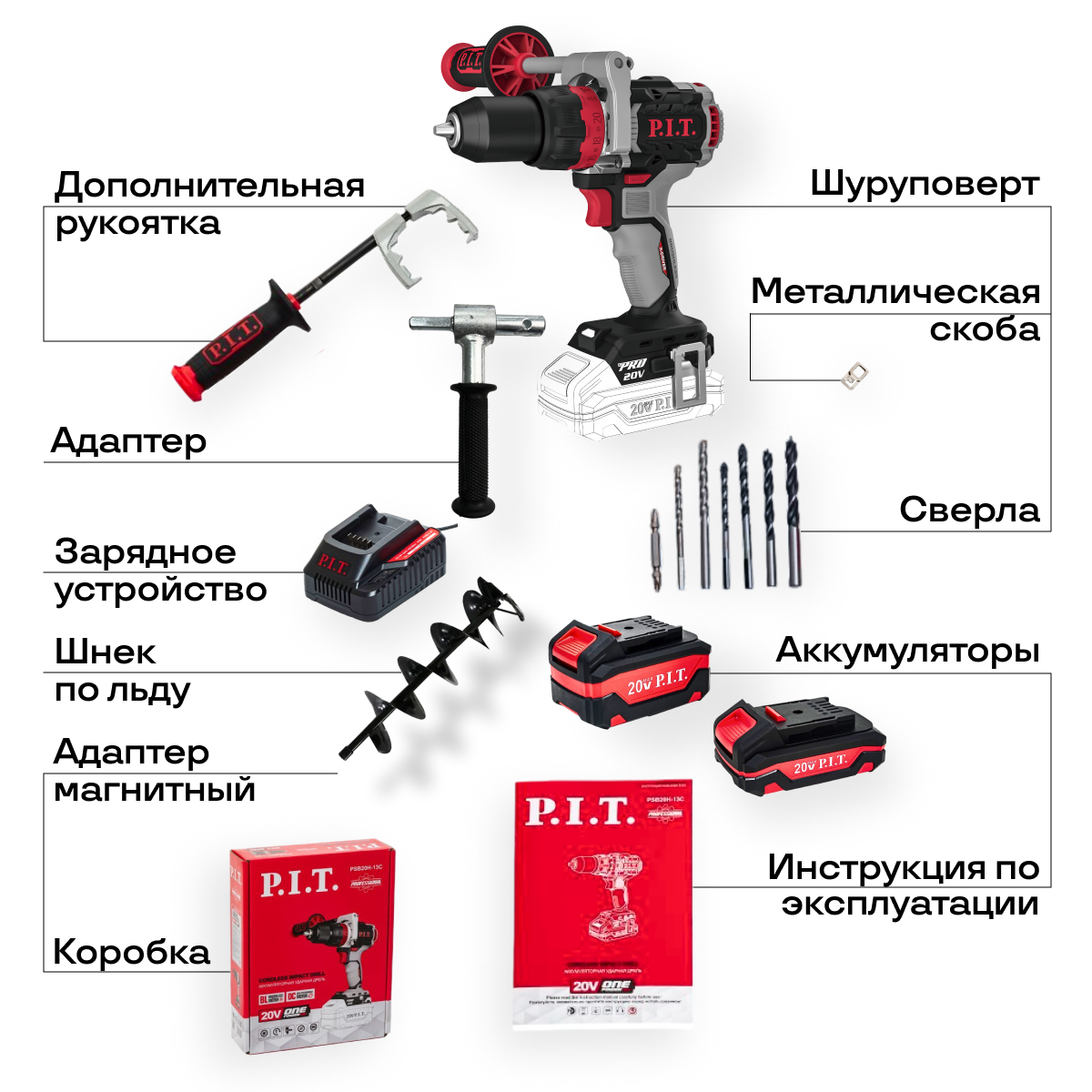 Шуруповерт для зимней рыбалки аккумуляторный бесщеточный PSB20H-13C/1 P.I.T., кейс, З/У, 2 АКБ 4Ач, адаптер для ледобура, шнек по льду 180мм