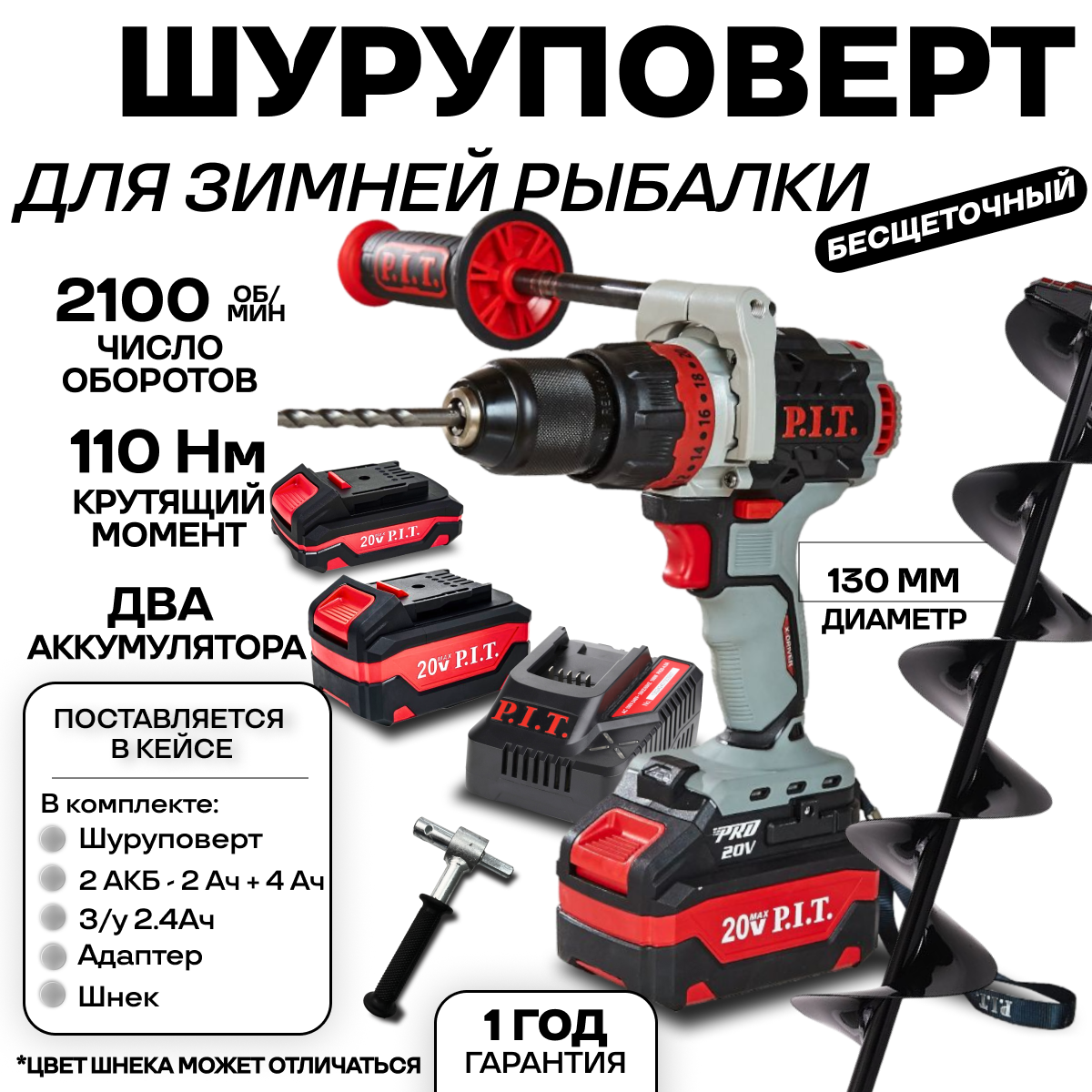 Шуруповерт для зимней рыбалки аккумуляторный бесщеточный PSB20H-13C/1 P.I.T, кейс, З/У, аккумуляторы на 4 и 2ач, адаптер для ледобура, шнек 130 мм