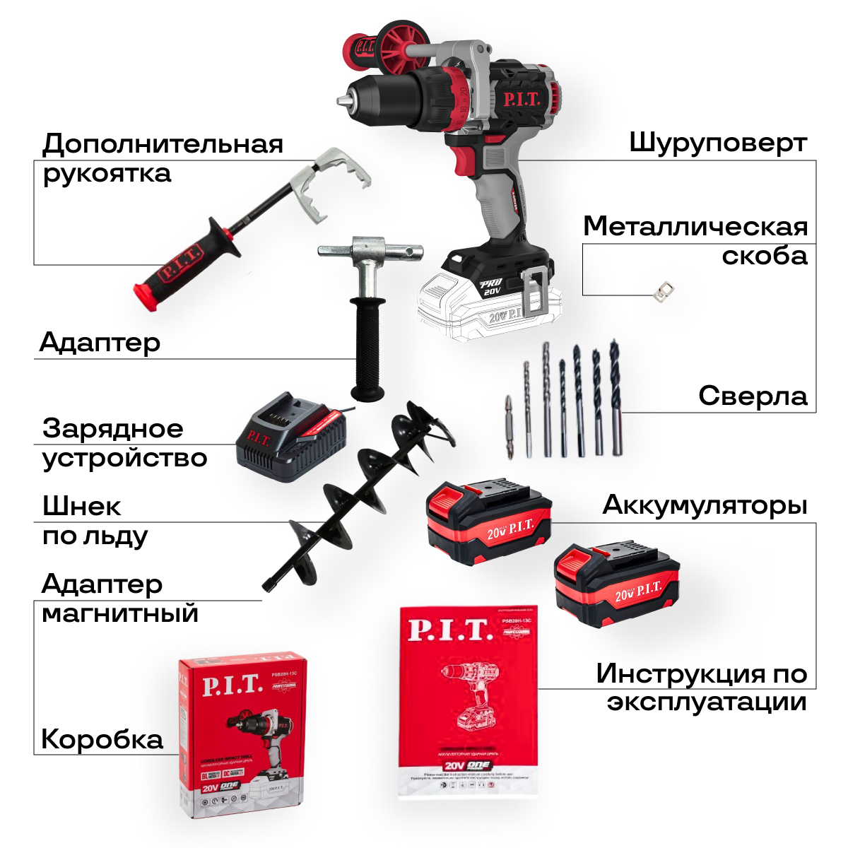 Шуруповерт для зимней рыбалки аккумуляторный бесщеточный PSB20H-13C/1 P.I.T., кейс, З/У, 2 АКБ 4Ач, адаптер для ледобура, шнек по льду 180мм