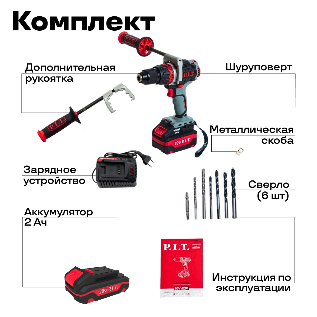 Шуруповерт для зимней рыбалки аккумуляторный бесщеточный PSB20H-13C/1 P.I.T., кейс, З/У, 2 АКБ 4Ач, адаптер для ледобура, шнек по льду 180мм