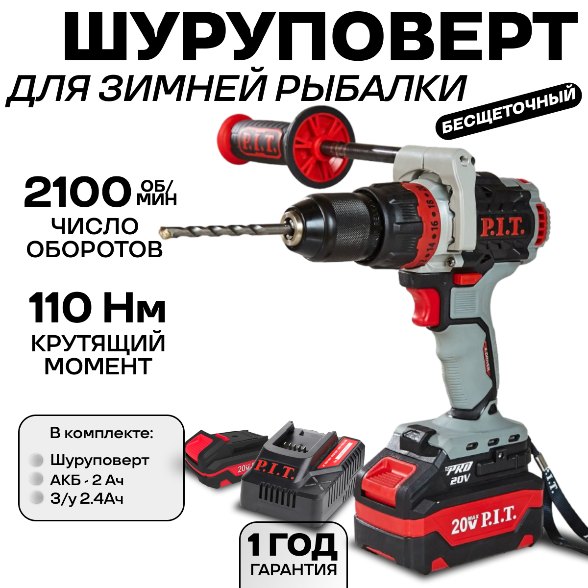 Шуруповерт для зимней рыбалки аккумуляторный бесщеточный PSB20H-13C/1 P.I.T, кейс, З/У, АКБ 4Ач + доп. АКБ 2Ач + адаптер для ледобура + шнек 180 мм