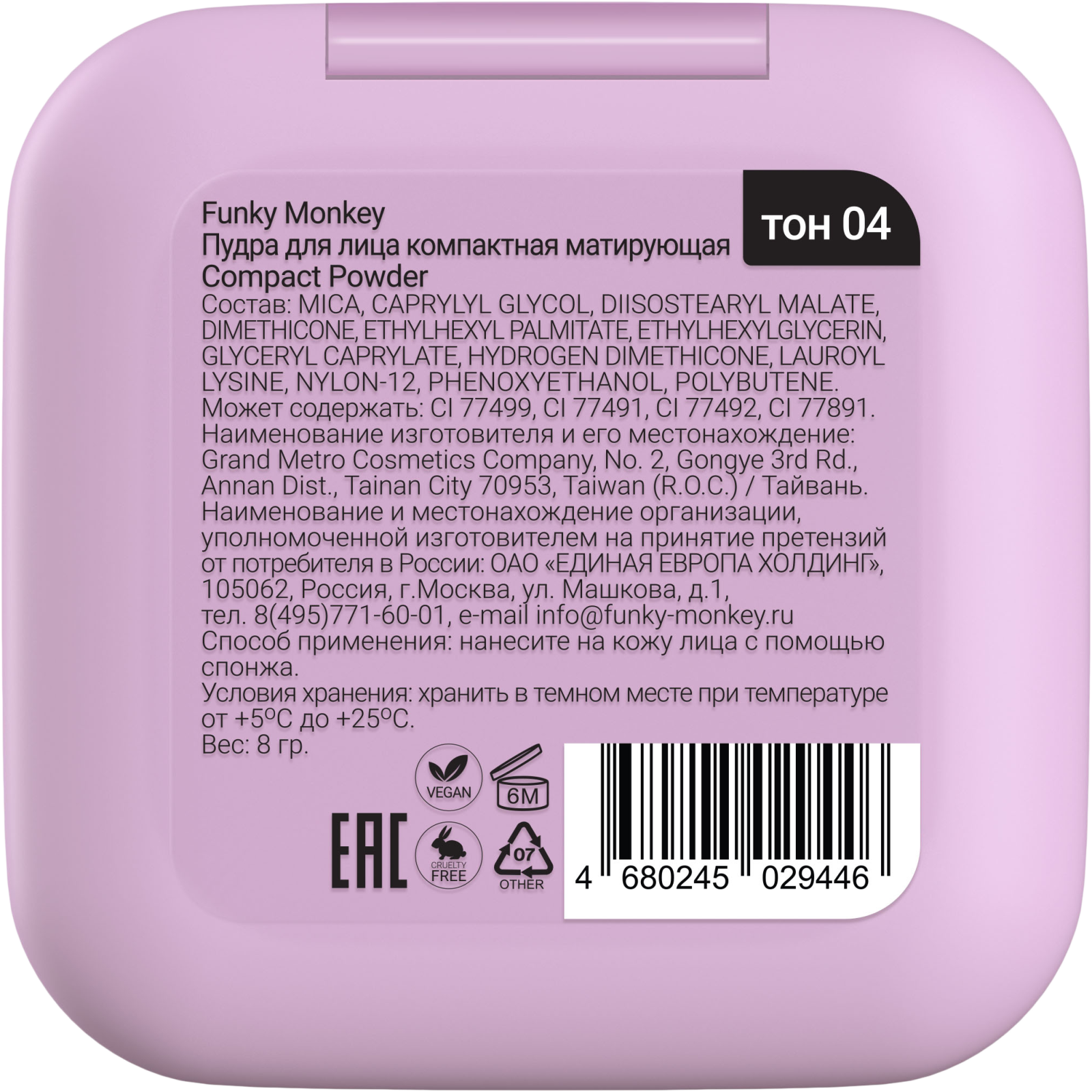 Купить FUNKY MONKEY Пудра для лица компактная матирующая Compact Powder, 8 г, 04