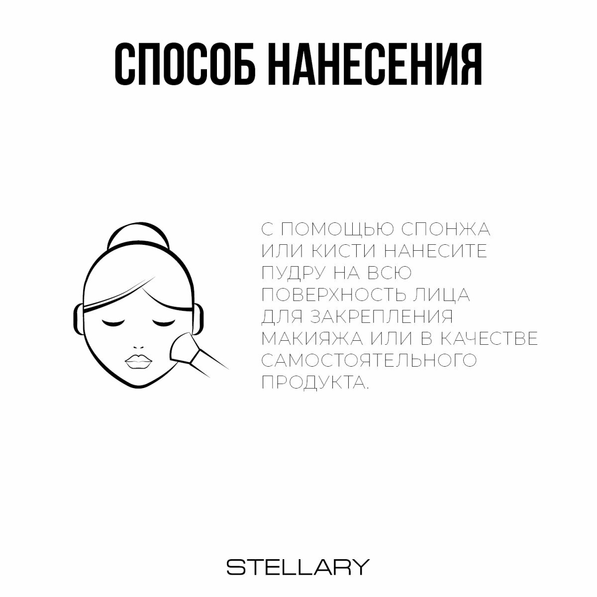 | Способ применения | Для полупрозрачного эффекта наносите пудру с помощью кисти STELLARY. Для более плотного покрытия наносите велюровым спонжем для пудры STELLARY PRO. |