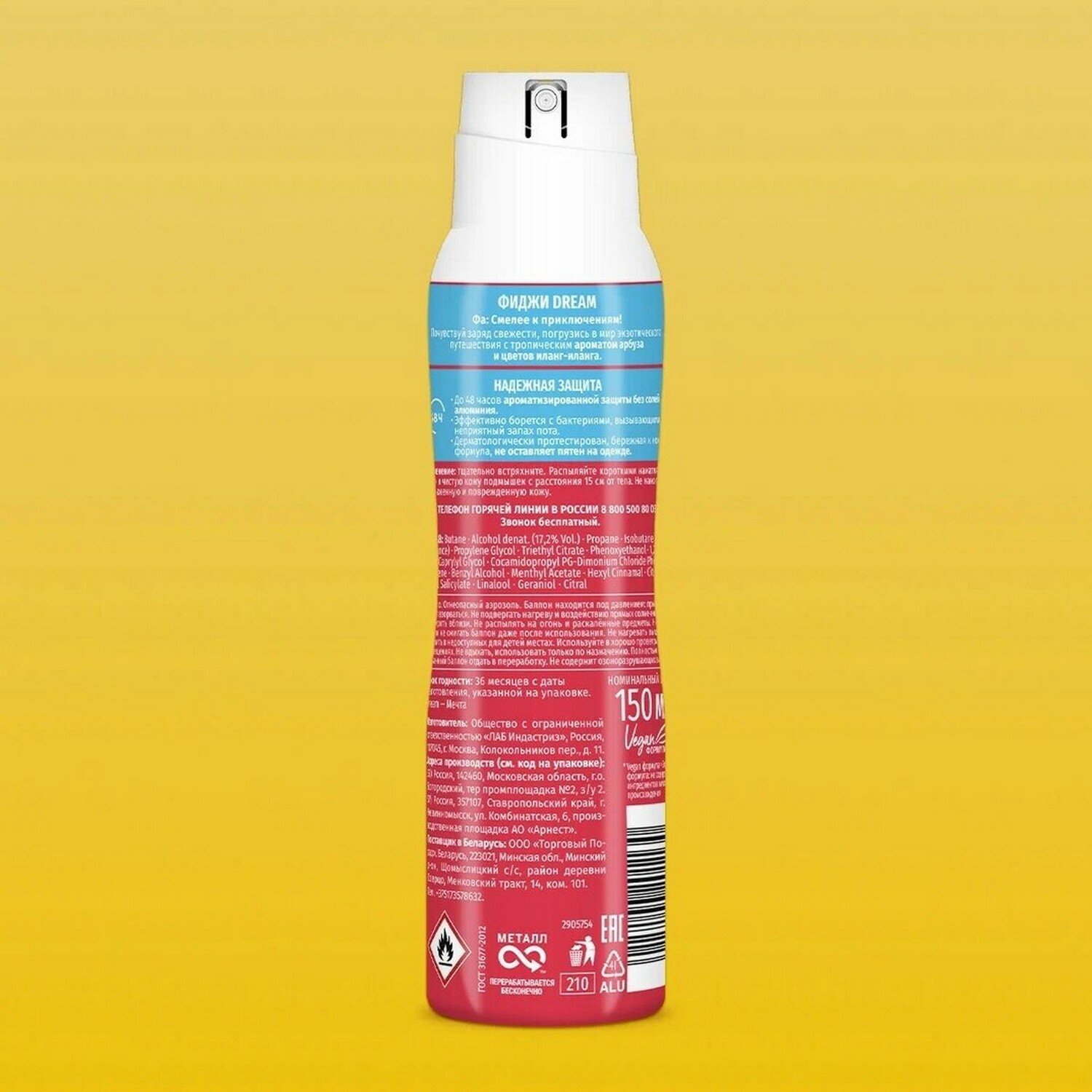 | Полный состав | Butane, alcohol denat. (17,18 %), propane, isobutane, triethyl citrate, parfum, phenoxyethanol, polyglyceryl-3 caprylate, butyloctanoic acid, limonen, benzyl alcohol, citronellol, hexyl cinnamal, linalool, geraniol, citral |