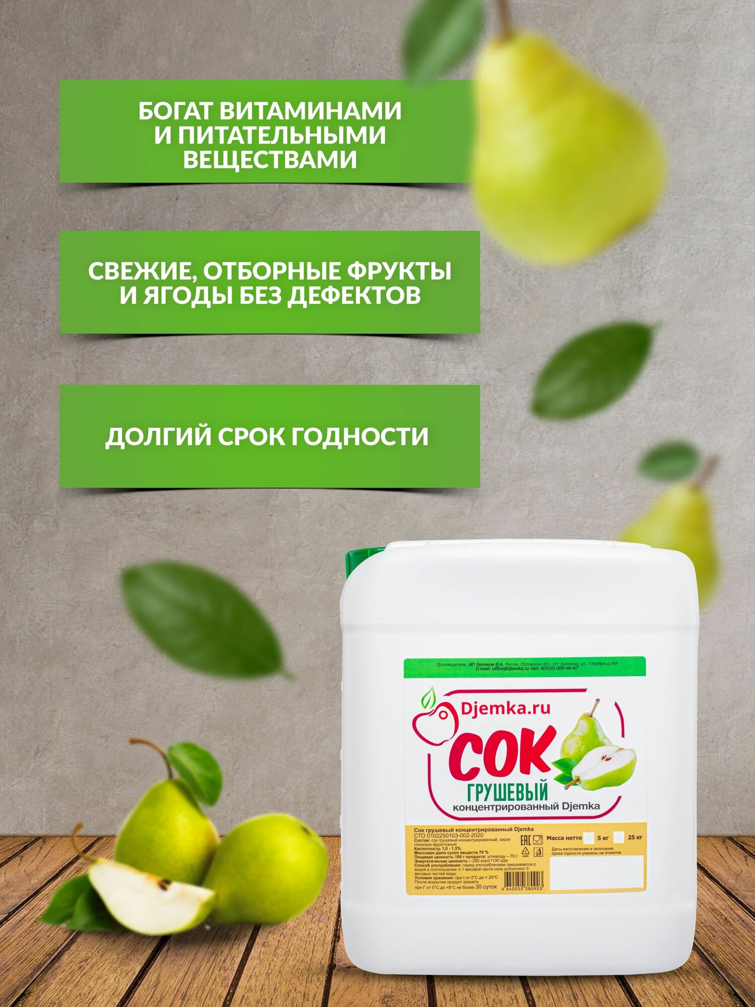 Сок Djemka.ru "Груша", концентрированный, в пластиковой канистре, 5 кг