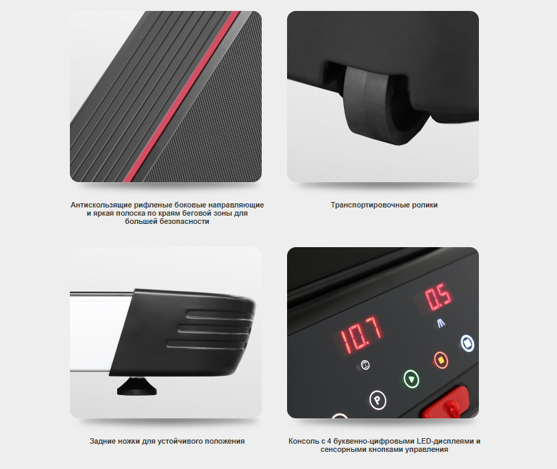 | Особенности | язык интерфейса: английский, 4 буквенно-цифровых дисплеев с сенсорными кнопками управления, спецификация программ: ручной режим, 15 встроенных программ (ходьба, быстрая ходьба, средний бег, бег трусцой, снижение веса, темповая тренировка, разминочный бег, подготовка к марафону, сжигание жира, аэробный бег, развитие скорости, интервальные тренировки, развитие выносливости, легкий бег, фартлек), 1 пульсозависимая программа; воспроизведение аудио файлов, встроенные динамики, Audio IN minijack 3.5 мм. (для аудио устройств), встроенный кардиодатчик на ручке, возможность подключения беспроводного кардиодатчика (поставляется отдельно), подставка под планшет/смартфон, питание от сети 220 В, беговое полотно: 1.8 мм, парафинированная дека, отсеки для аксессуаров, габариты в сложенном состоянии (ДхШхВ): 24 х 77 х 150 см |