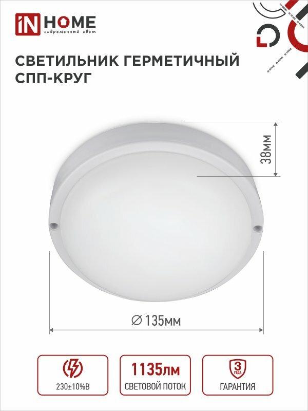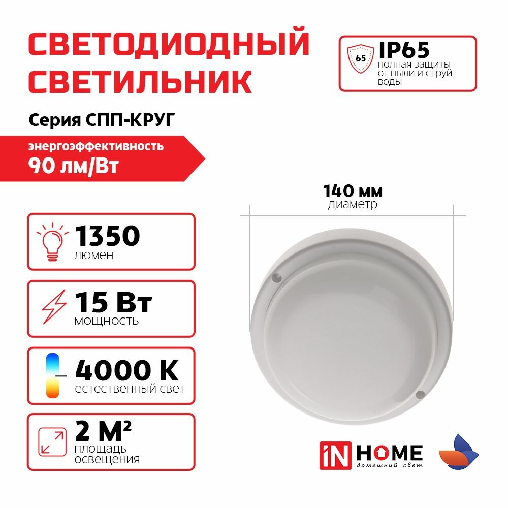 Светильник светодиодный герметичный СПП 1540-КРУГ 15Вт 4000К 1350лм IP65 140мм IN HOME 4690612044880 интересное: