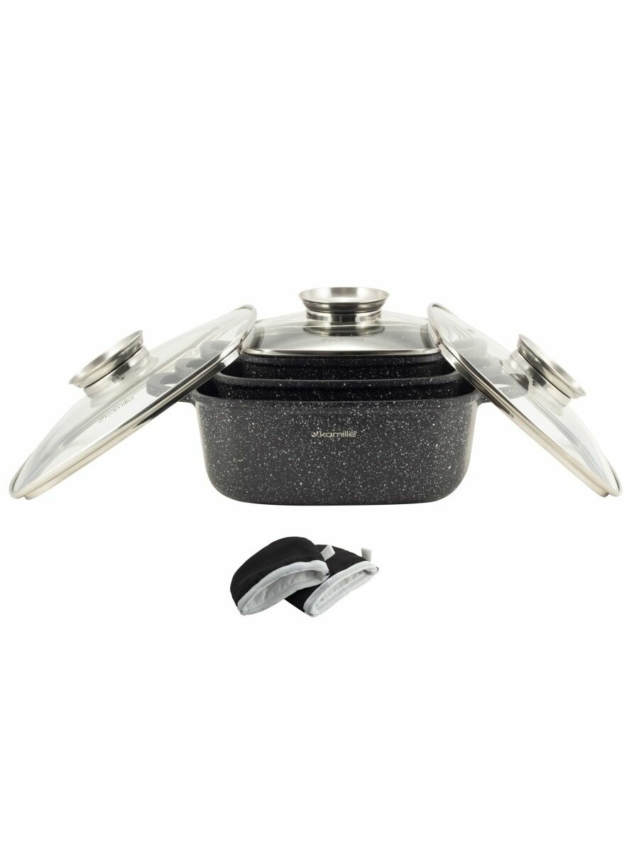 Набор посуды 7 предметов с прихватками (кастрюли квадратные 20см,, 24см., 28см., прихватки 2шт) KAMILLE.