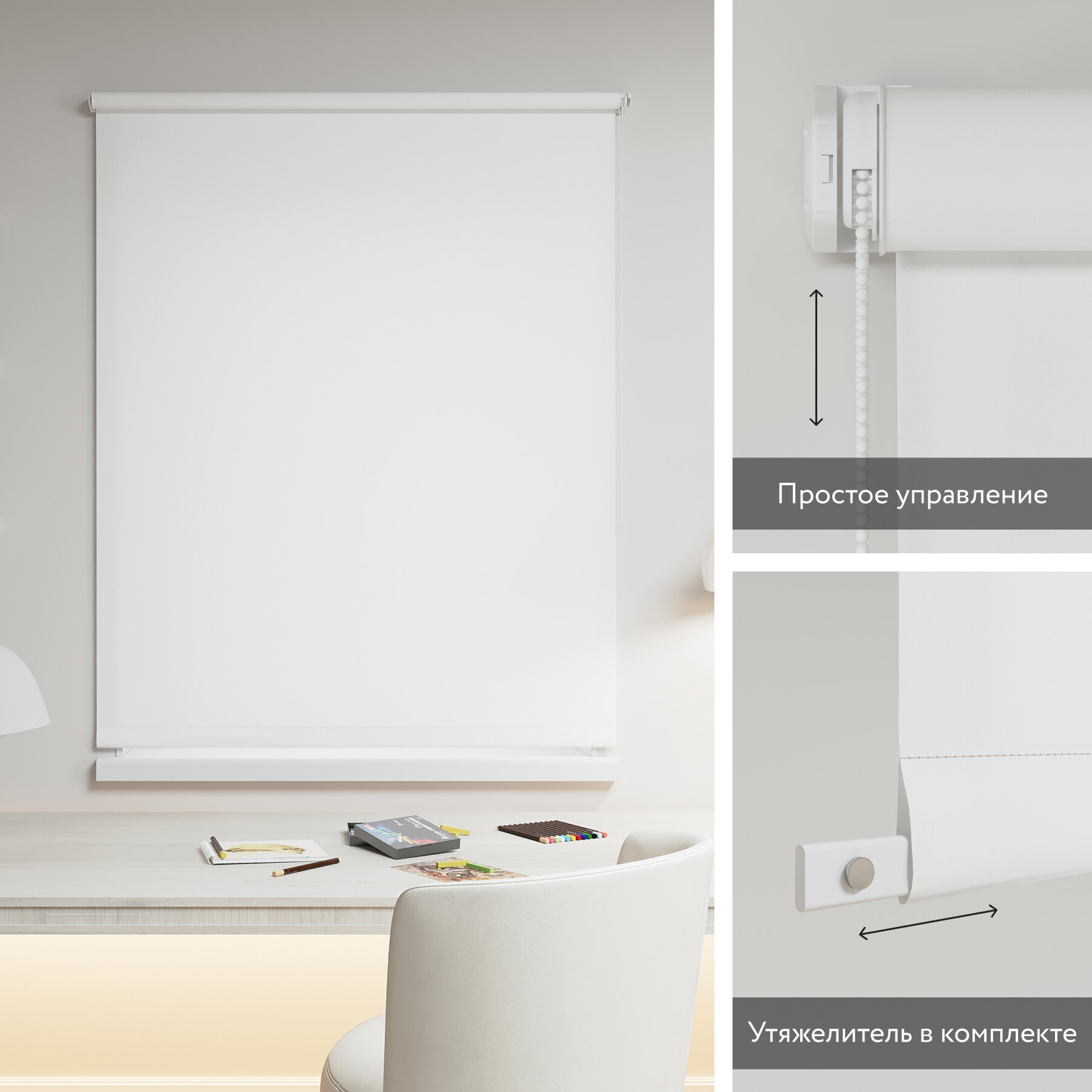 | Дополнительная информация | Механизм с цепочкой, упорный валик, боковые кронштейны, навесные кронштейны с регулировкой под толщину оконного профиля, монтажные площадки для крепления на глухую створку, двухсторонний скотч, крепежный комплект, фиксатор, ограничитель размотки ткани. |
