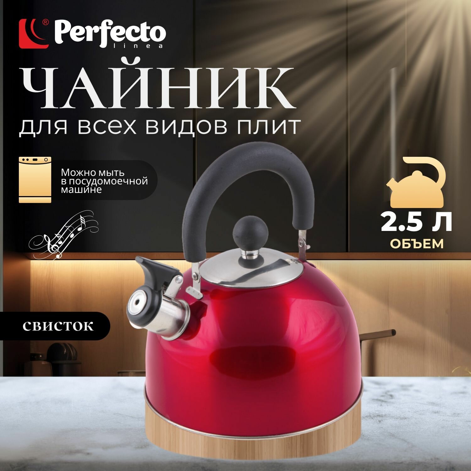 Чайник со свистком 2.5 л PERFECTO LINEA серия Holiday, нержавеющая сталь, цвет вишневый металлик (52-121517)