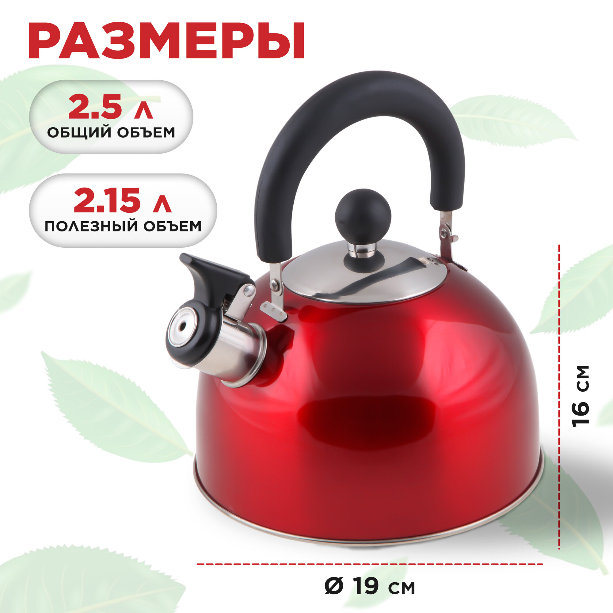 Чайник со свистком, нержавеющая сталь, 2.5 л, вишневый металлик, PERFECTO LINEA (диаметр 19 см, высота 16 см, общий объем изделия 2,5л, (52-121517)