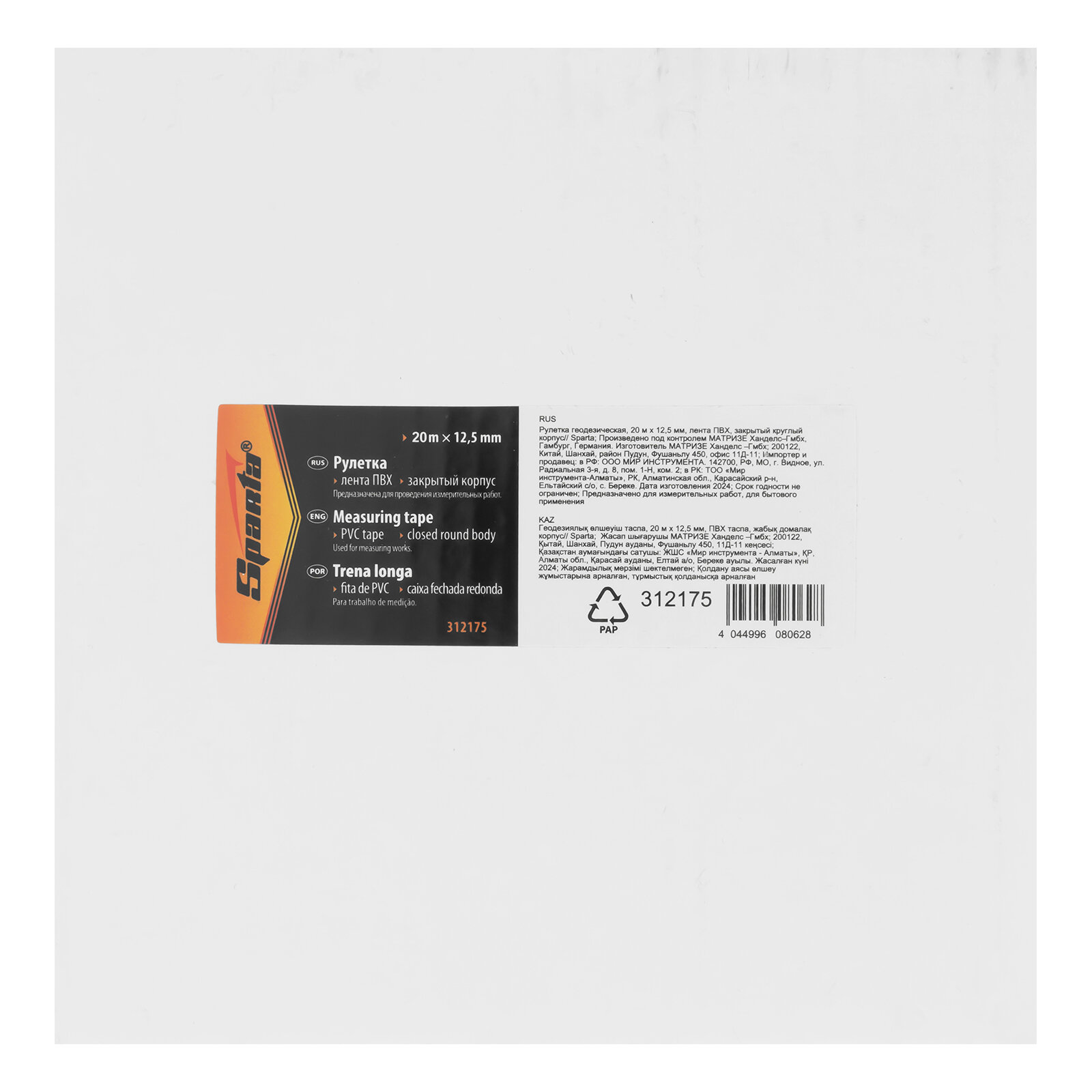 Рулетка геодезическая, 20 м х 12,5 мм, лента ПВХ, закрытый круглый корпус// Sparta 312175 .