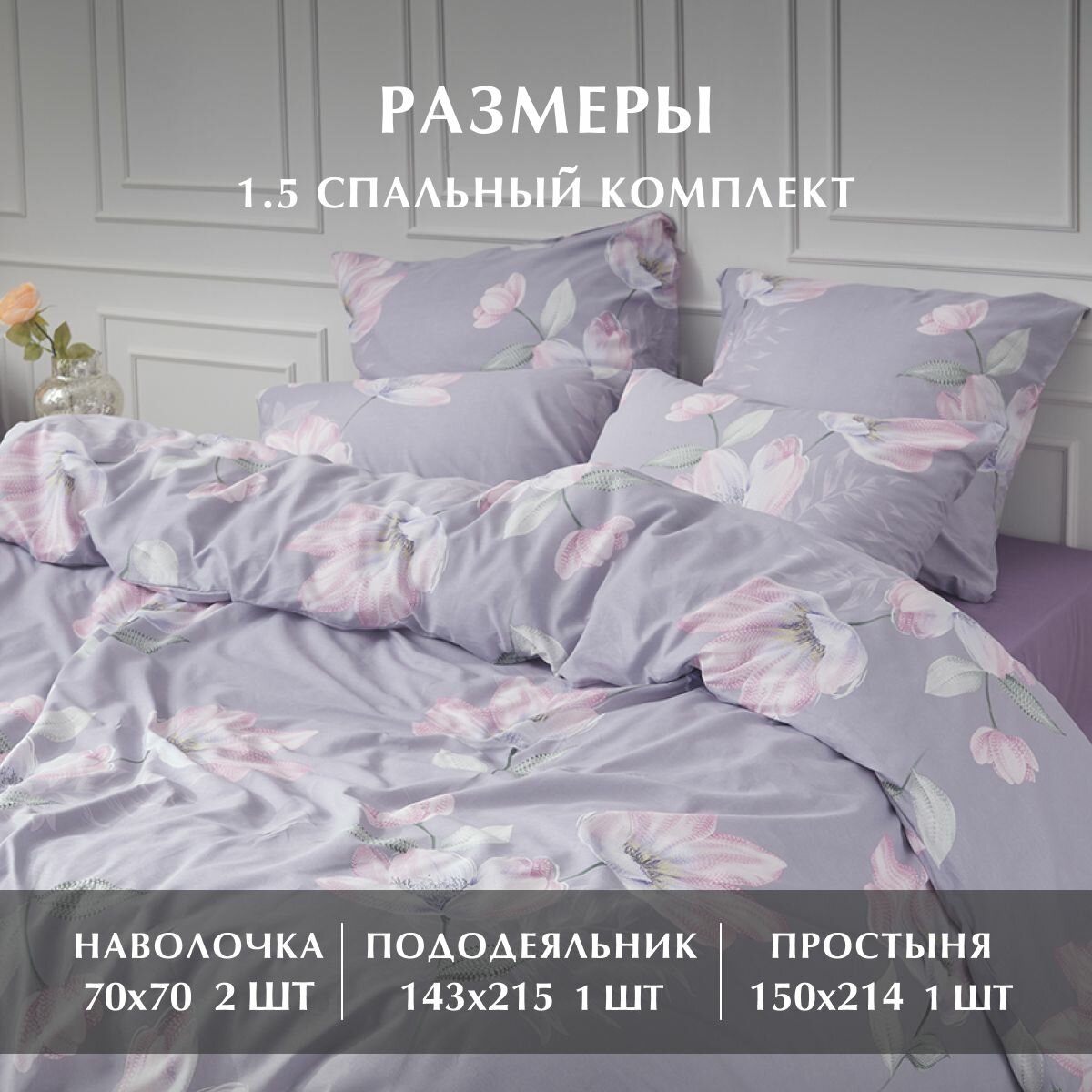 Постельное белье, Поплин, Евро, 2 наволочки 70х70, GM, Lilac grey 100% хлопок на Новый год