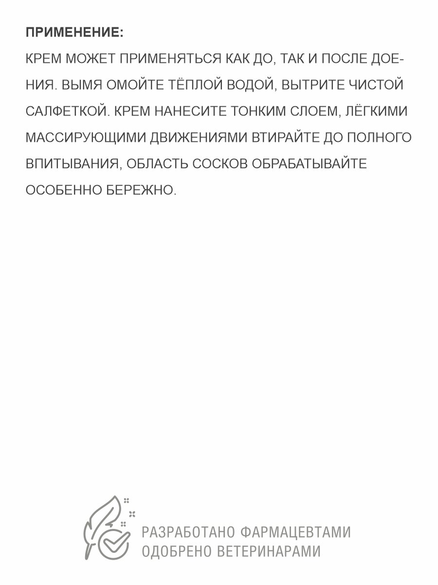 | Способ применения | Крем может применяться как до, так и после доения. Вымя омыть теплой водой, вытереть чистой салфеткой. Крем нанести тонким слоем, легкими массирующими движениями втирать до полного впитывания, область сосков обрабатывать особенно бережно. В процессе ухода за выменем крем также питает, смягчает и увлажняет кожу рук персонала, способствует разглаживанию морщин. |
