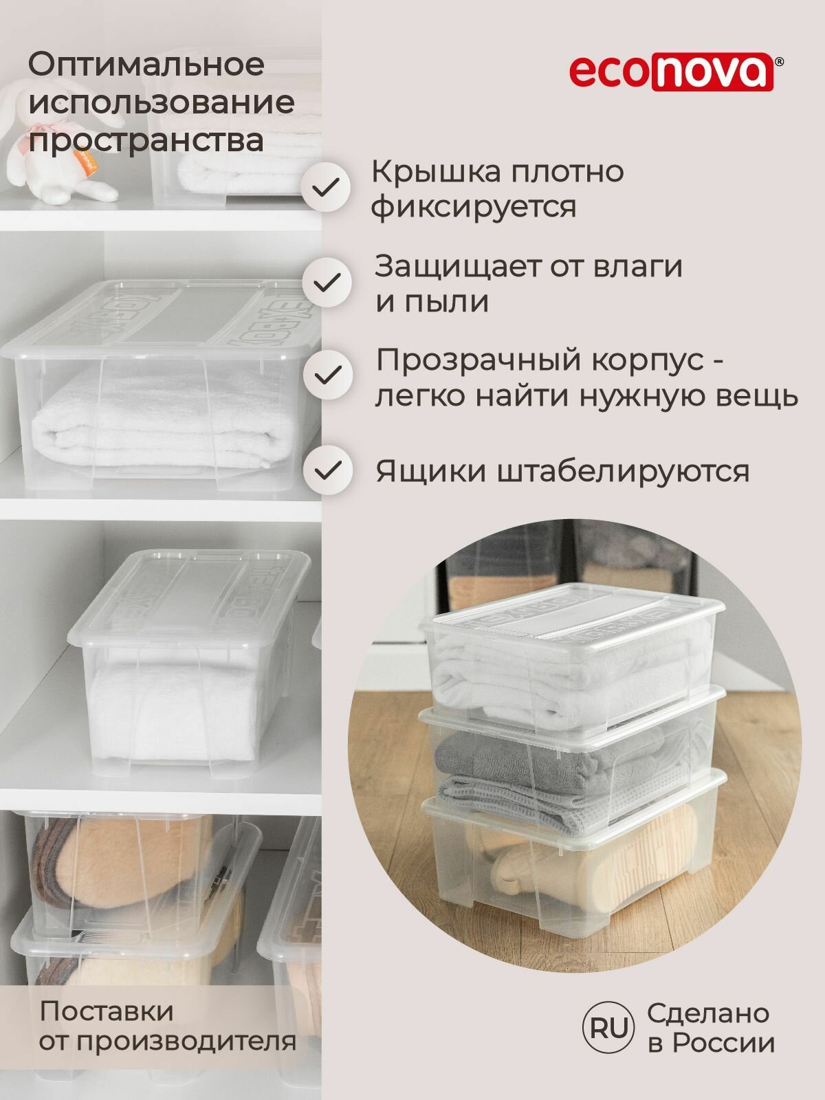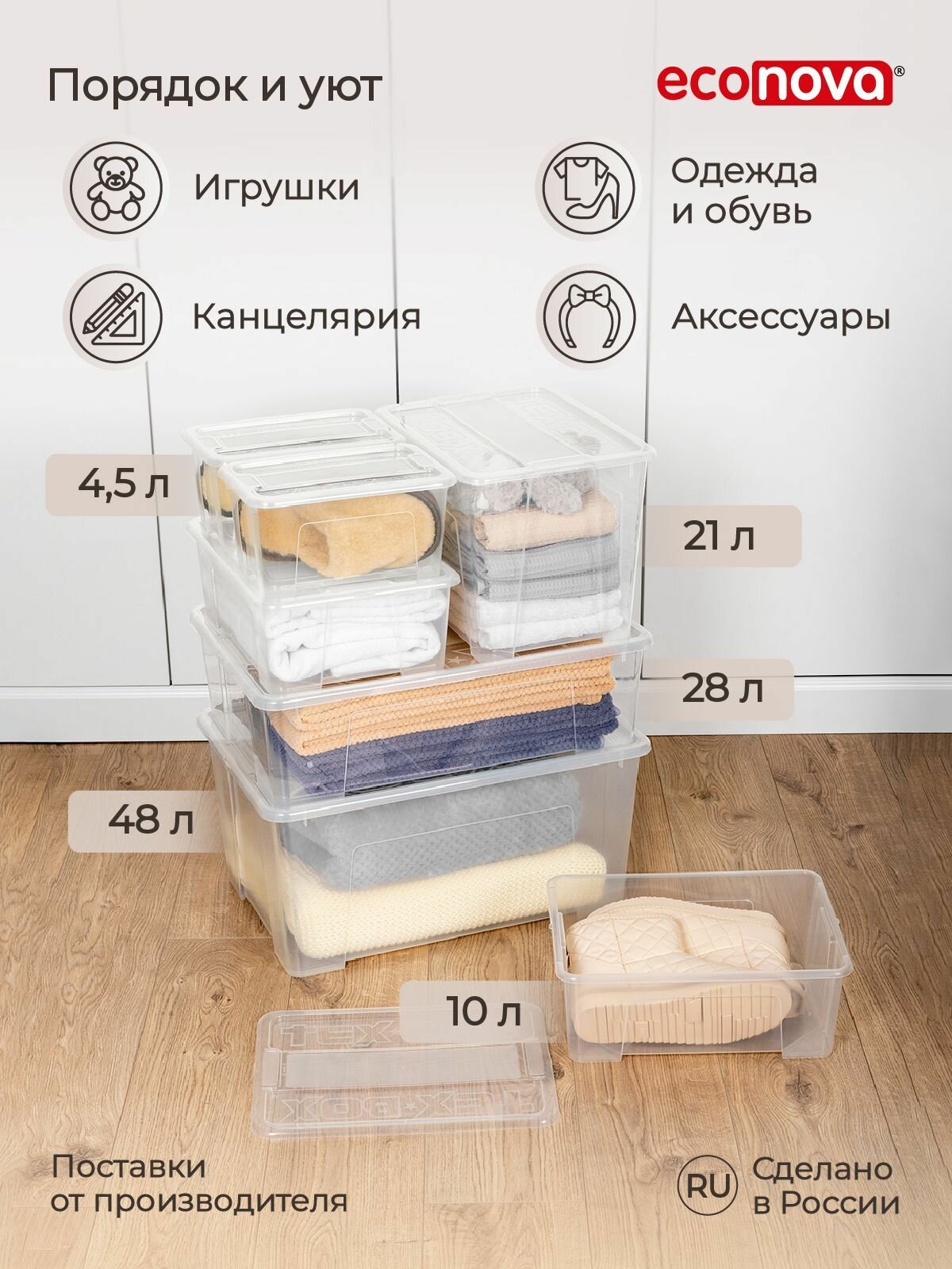 | Комплектация | Ящик универсальный с крышкой Tex-box 10 литров, 38*28*14 см (прозрачный), Econova |