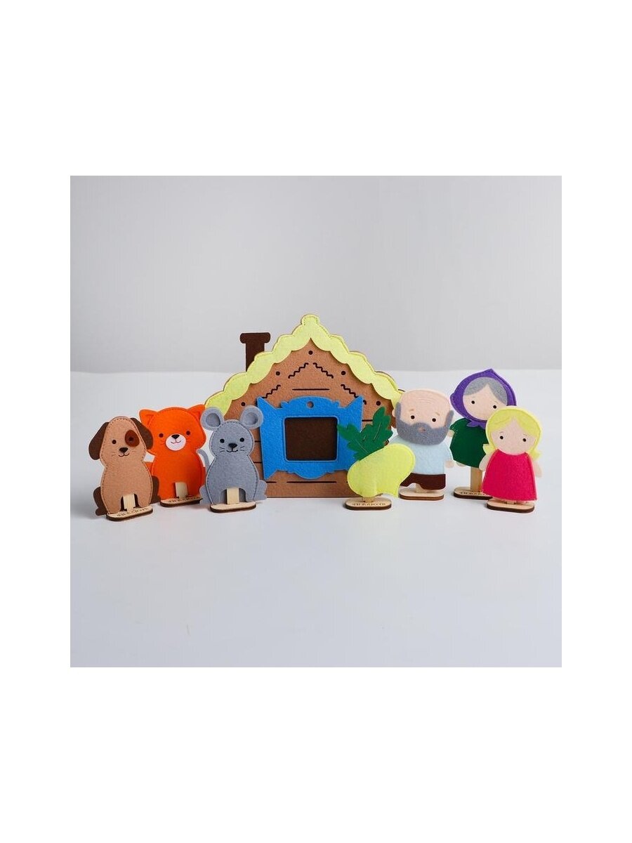 | Комплектация | домик из фетра (165*145)- 1 шт.; фигурка из фетра (8 см) - 7 шт (дед, баба, внучка, репка, собака, кошка, мышка), плашка с комплектом из 8 подставок - 1 шт |