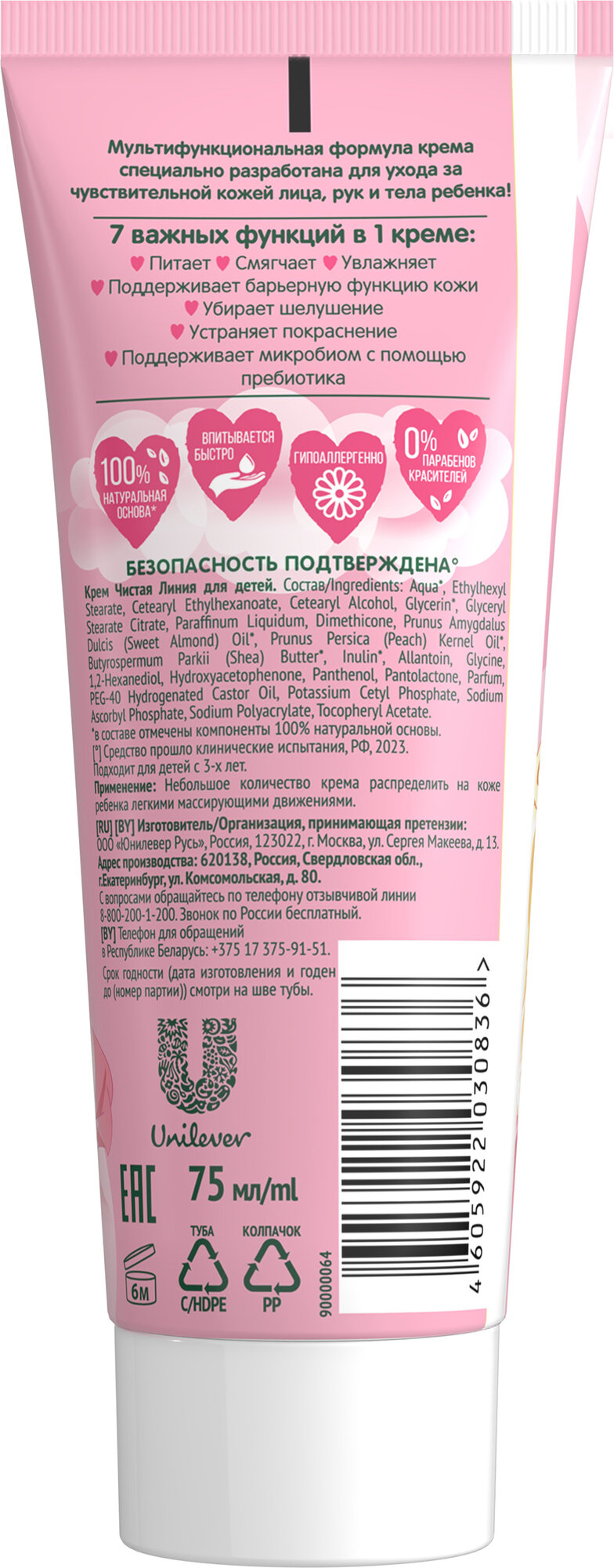 Чистая линия Крем для детей 3+ без парабенов и красителей, 75 мл