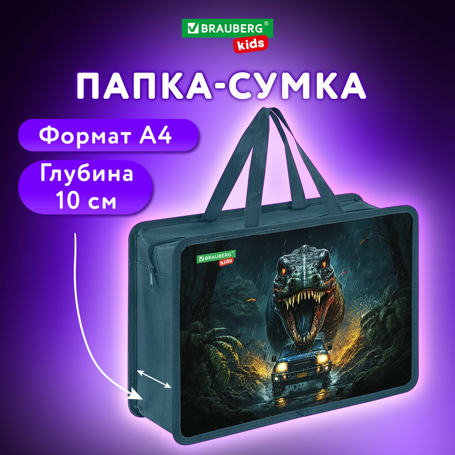Папка на молнии с ручками Brauberg Kids А4, 1 отделение, пластик, 100 мм, Dino chase, 272119 интересное: