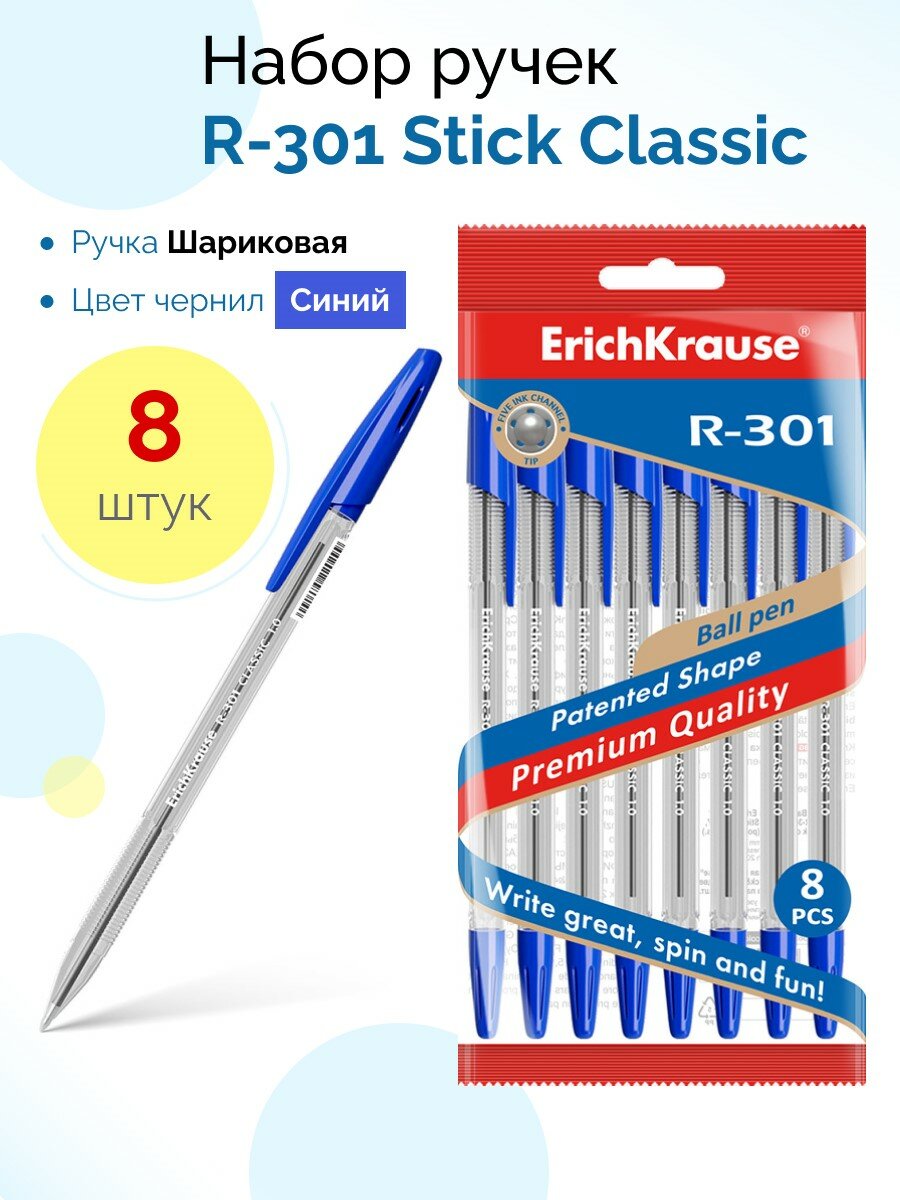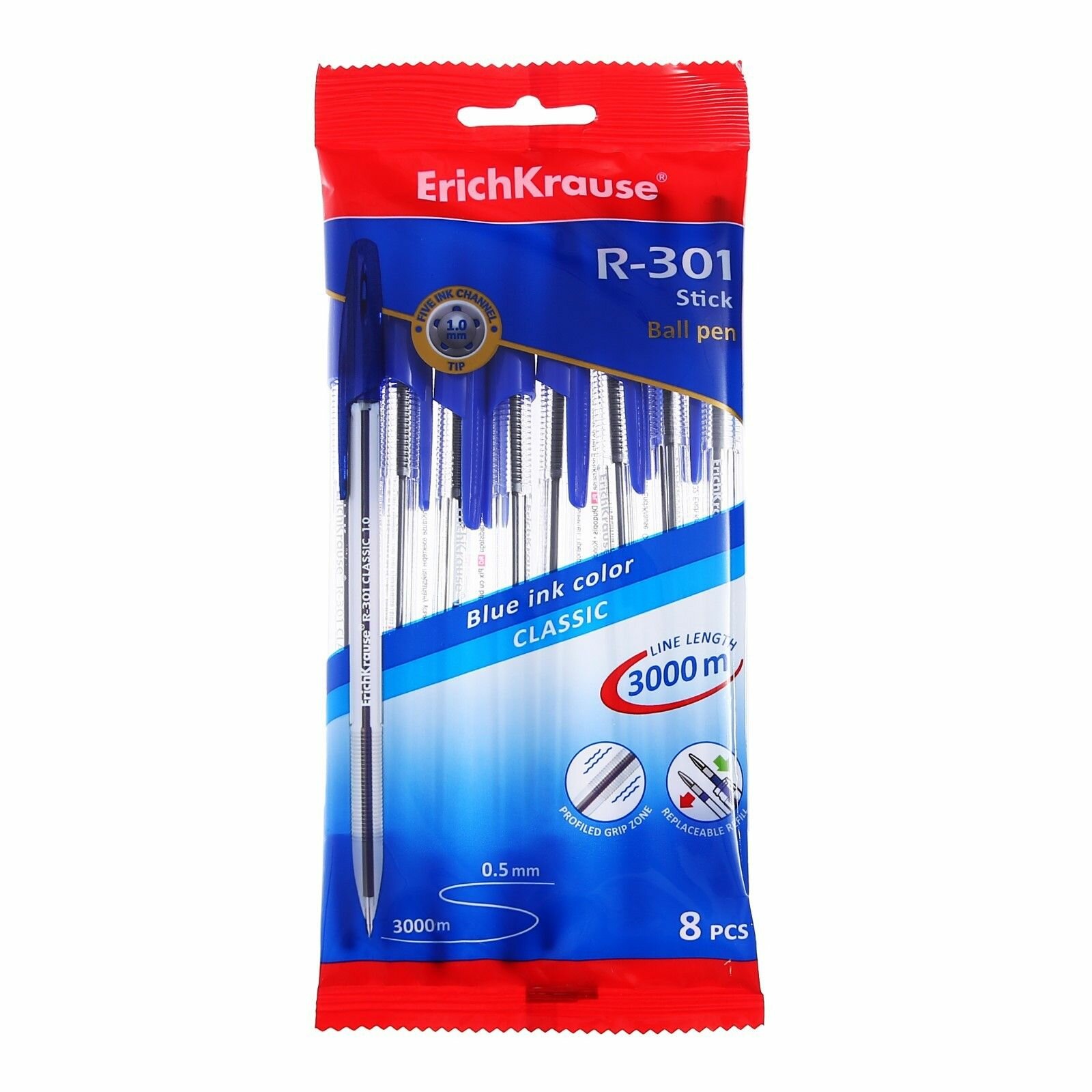 Набор из 8 ручек шариковых ErichKrause R-301 Stick Classic 1.0, цвет чернил синий (в пакете)