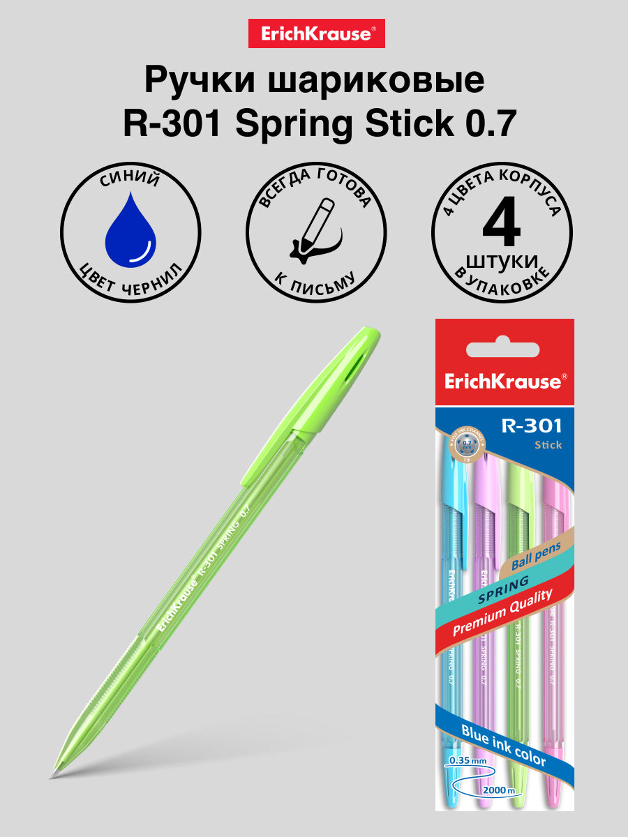 Ручка шариковая ErichKrause® R-301 Spring Stick 0.7, цвет чернил синий (в пакете по 4 шт.)
