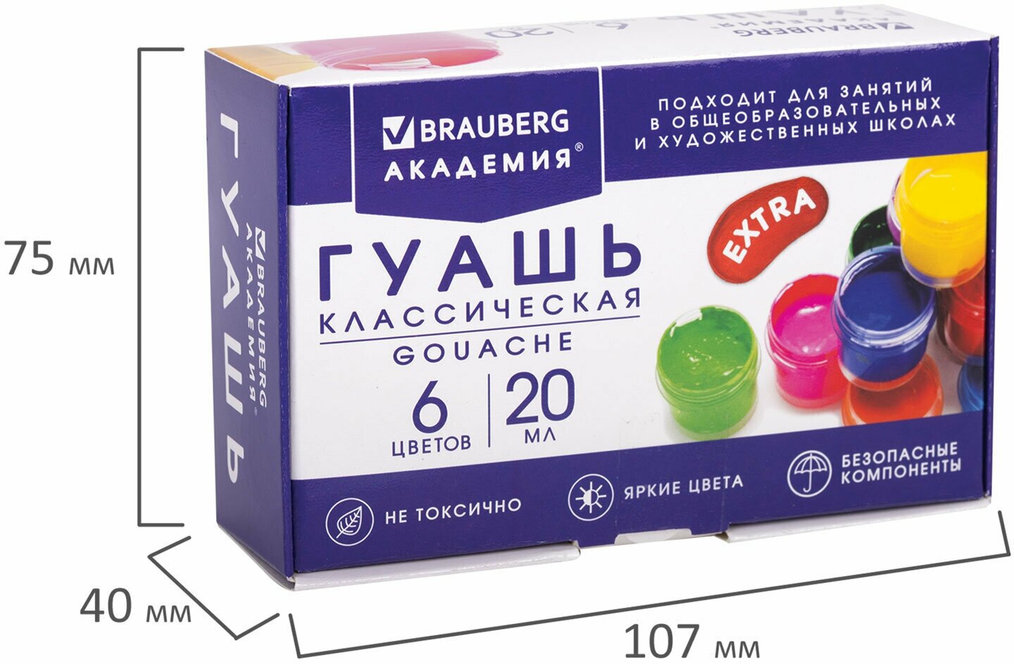 | Комплектация | Гуашь BRAUBERG "АКАДЕМИЯ КЛАССИЧЕСКАЯ ЭКСТРА", 6 цветов по 20 мл, 192371 |