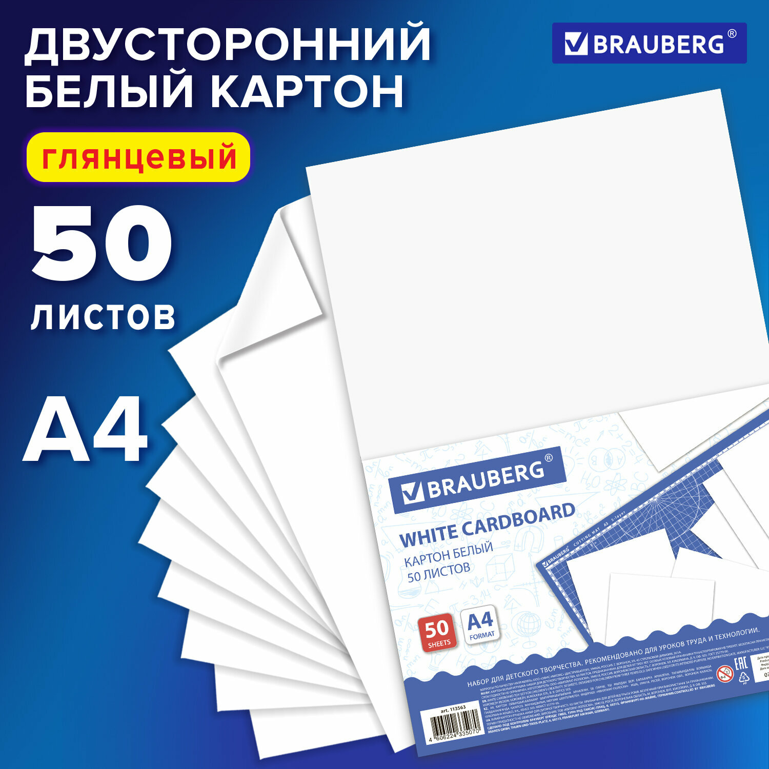 Картон белый А4 мелованный (белый оборот), 50 листов, BRAUBERG, 210х297 мм, 113563