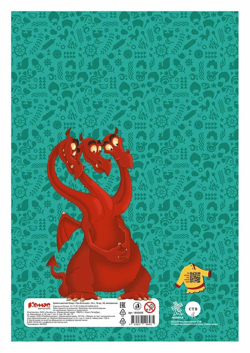 Бумага цветная двусторонняя Комус Три богатыря (А4, 16 листов, 16 цветов, мелованная) (1843420) интересное: