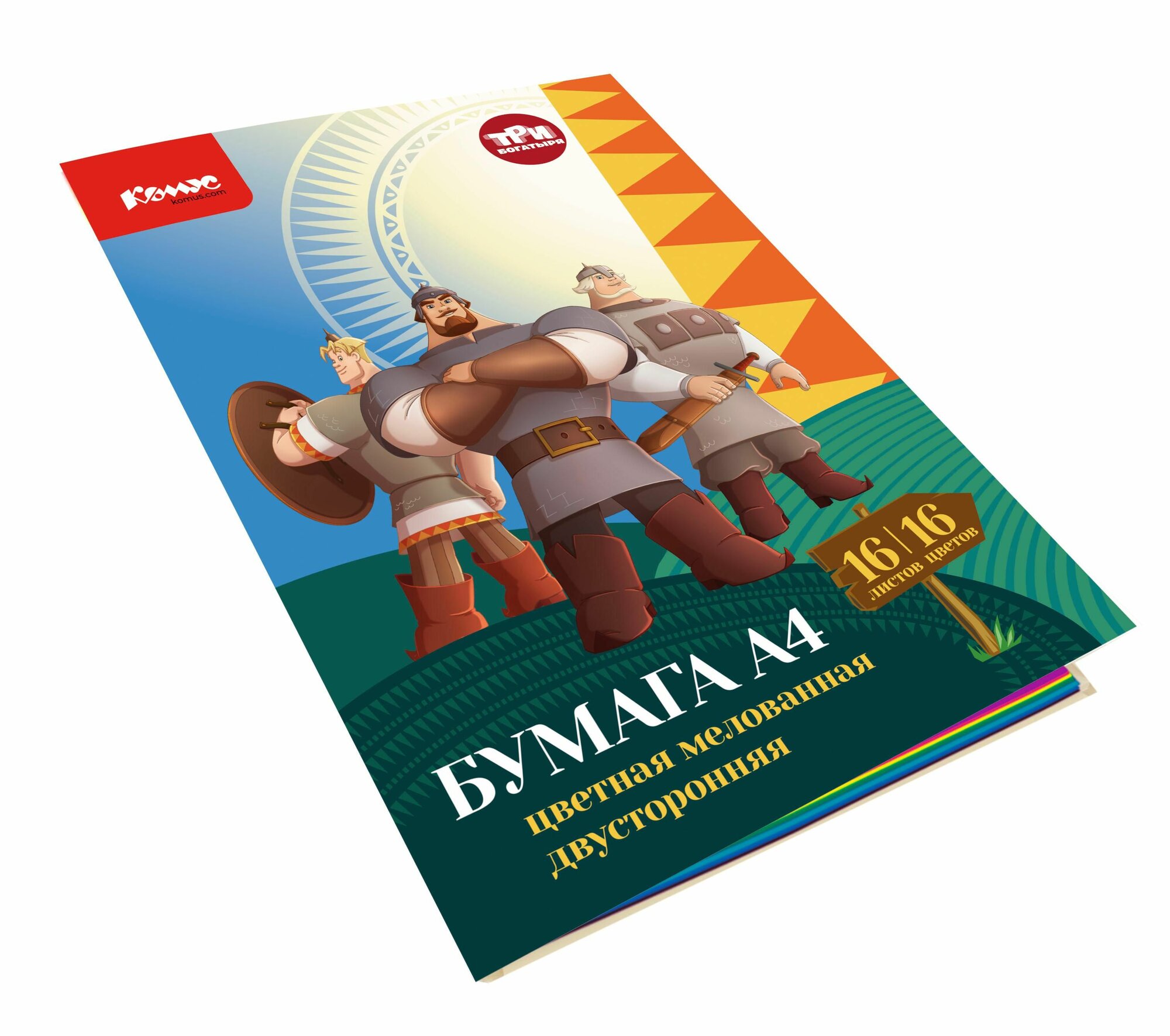 Купить Бумага цветная двусторонняя Комус Три богатыря (А4, 16 листов, 16 цветов, мелованная) (1843420)