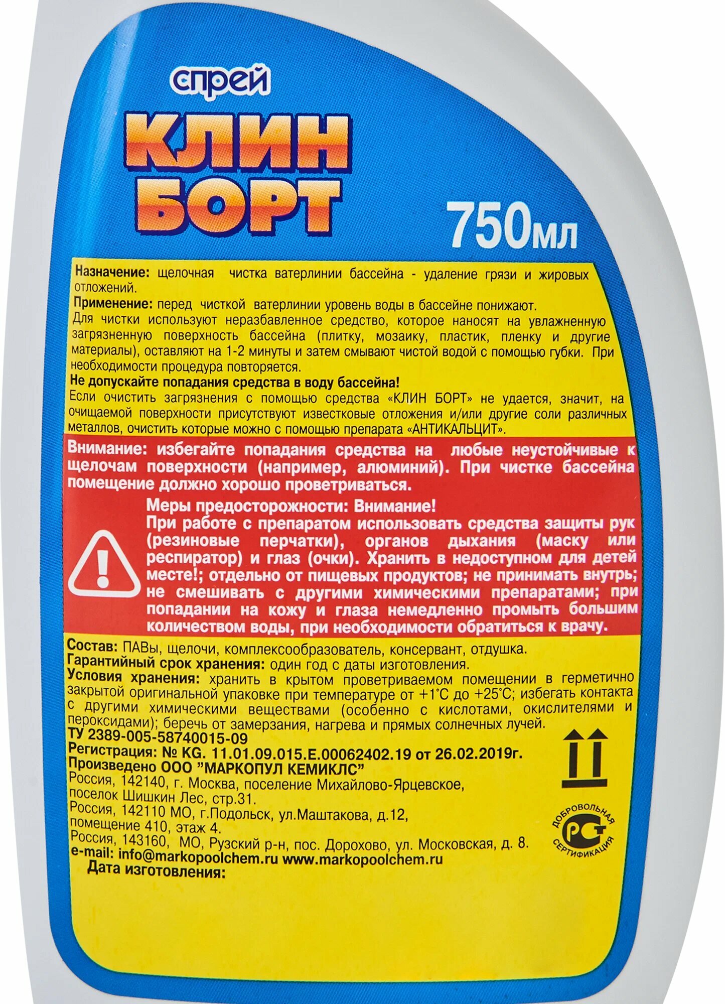 | Дополнительная информация | Клин борт 0.75 л, средство для чистки бассейна, спрей для чистки ватерлинии,чистка поверхностей бассейна, химия для бассейнов |