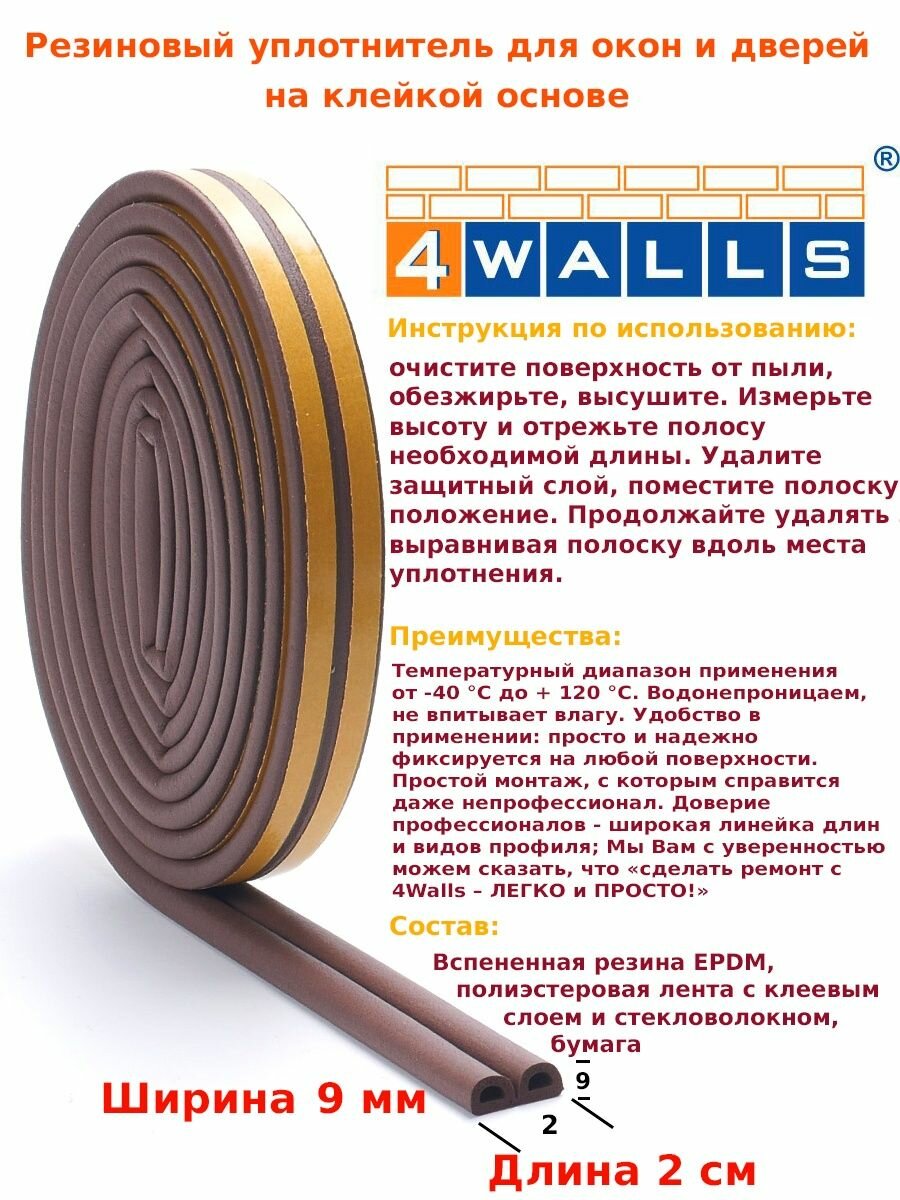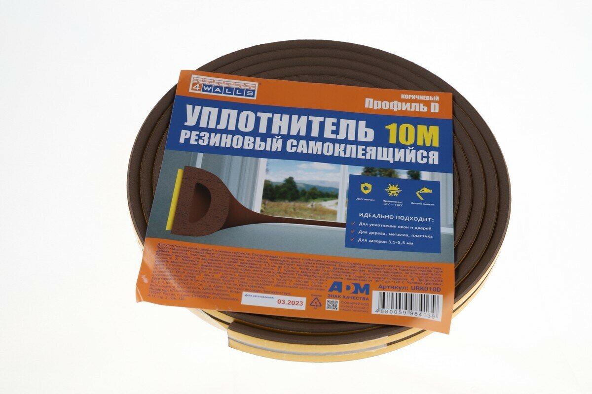 Купить Уплотнитель для дверей и окон самоклеящийся 4WALLS D-профиль 8x9мм, 10м, коричневый URK010D