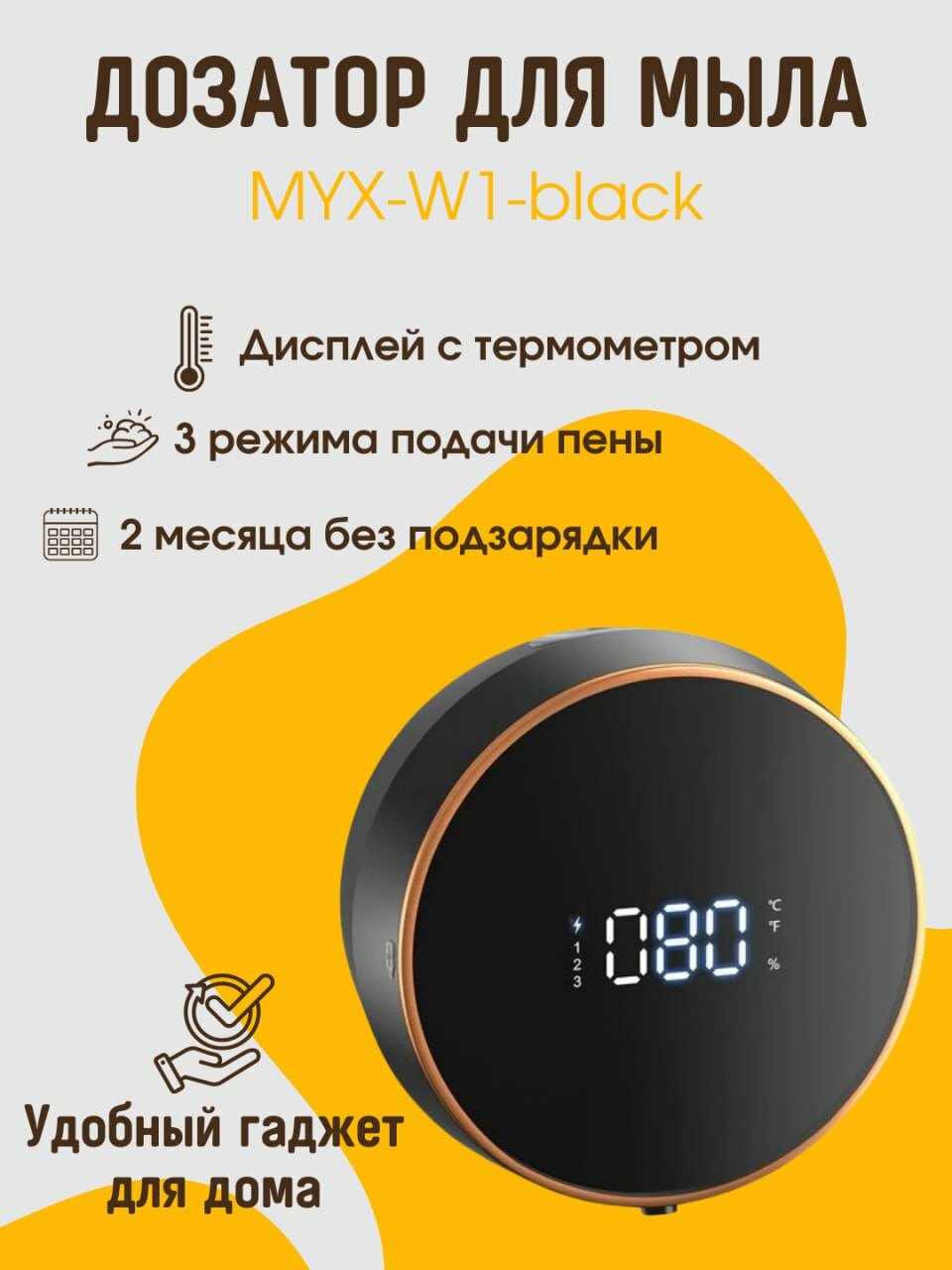 | Подробная комплектация | диспенсер, кабель для зарядки USB Type-c, крепление на стену на 3М скотчем |