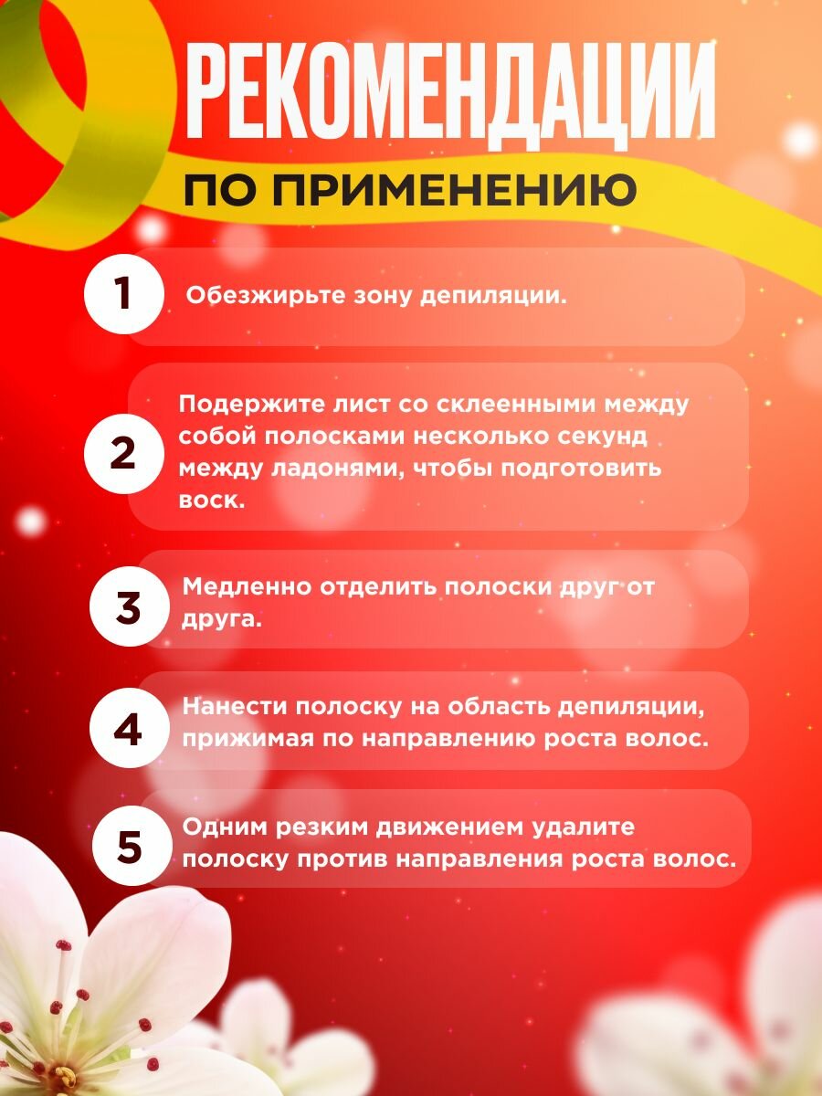 | Способ применения | обезжирьте зону депиляции. Подержите лист со склеенными между собой полосками несколько секунд между ладонями, чтобы подготовить воск. Медленно отделить полоски друг от друга. Нанести полоску на область депиляции, прижимая по направлению роста волос Одним резким движением удалите полоску против направления роста волос |