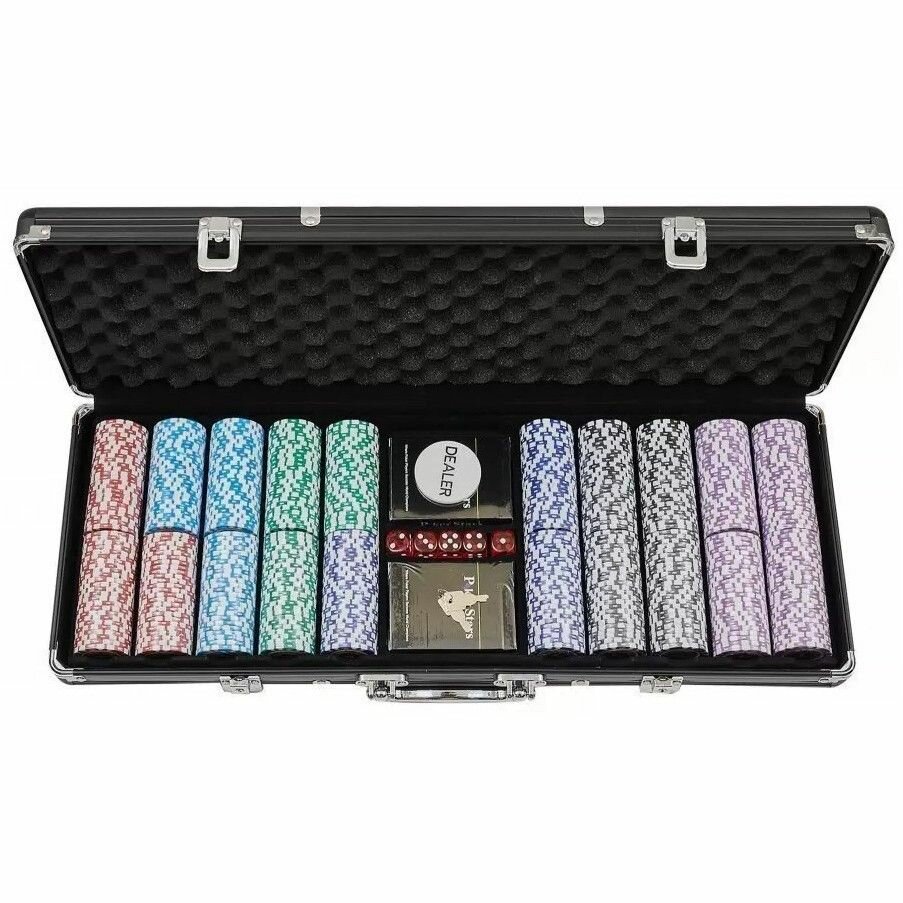 | В наборе | - 500 фишек (номиналы фишек: 5 - 75 шт., 10 - 75 шт., 25 - 75 шт., 50 - 75 шт., 100 - 100 шт., 500 - 100 шт.); - 5 костей; - 2 колоды карт; - фишка дилера; - кейс; - ключи от кейса. |