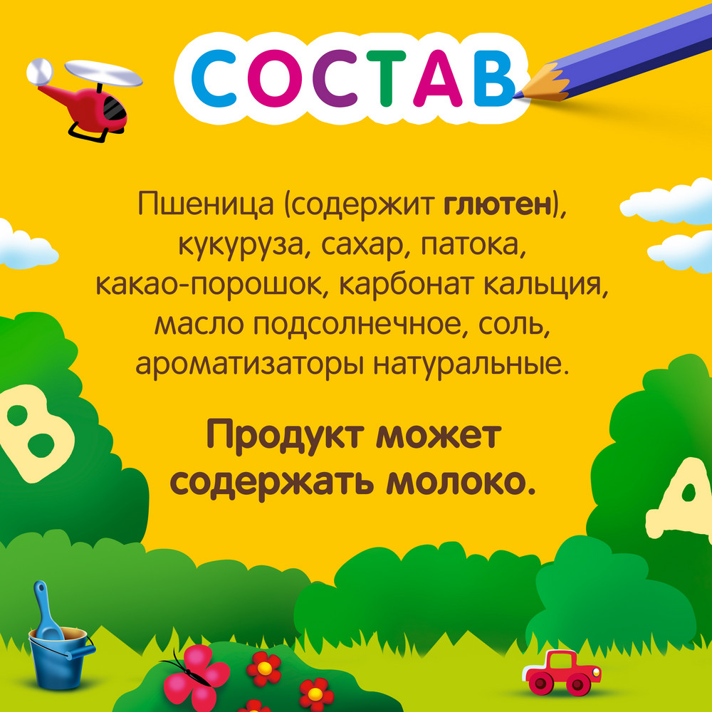 | Состав | пшеница (содержит глютен) / кукуруза / сахар / сухой глюкозный сироп / какао-порошок алкализованный / карбонат кальция / масло подсолнечное / соль / ароматизаторы натуральные; продукт может содержать молоко |