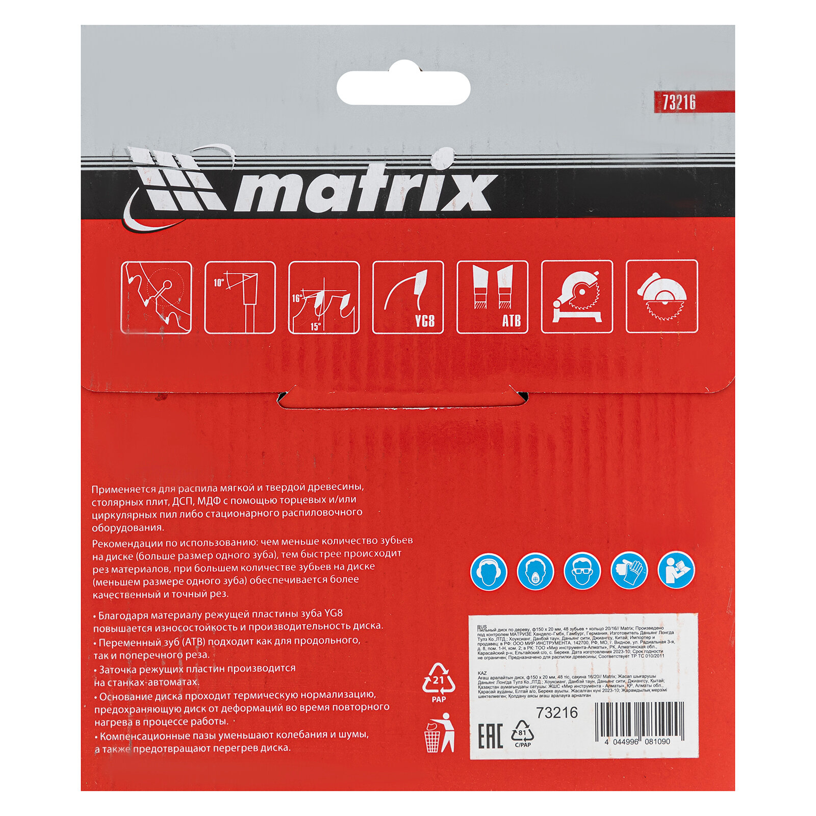 Купить Пильный диск по дереву, 150 х 20 мм, 48 зубьев, кольцо 16/20 Matrix Professional