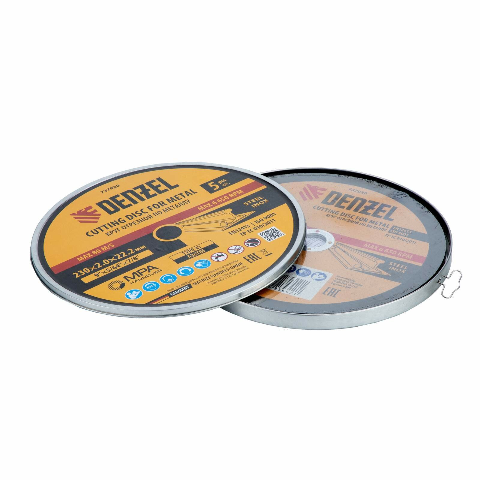 Купить Круг отрезной по металлу Denzel, 5 штук, 230 х 2.0 х 22.2 мм, A36TBF, в металлической банке, 737920