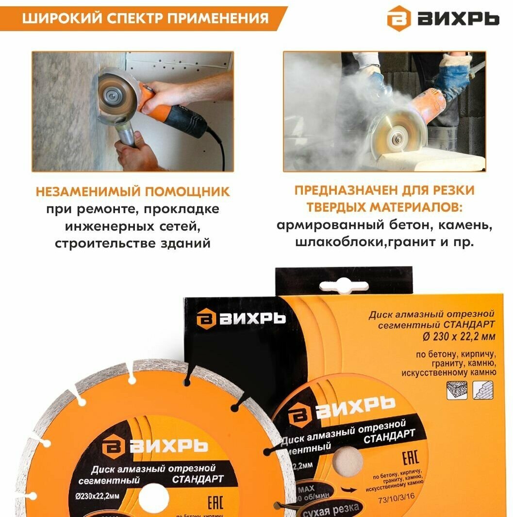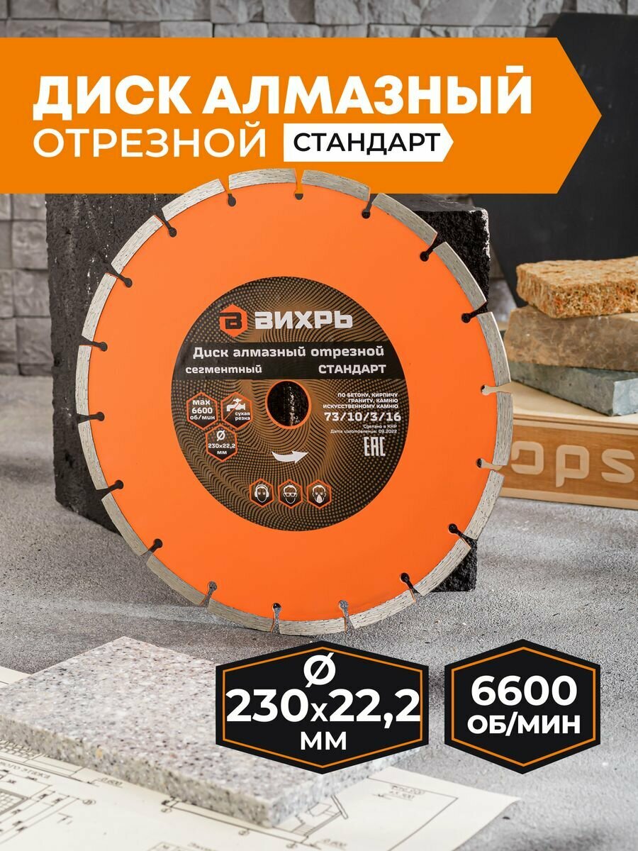 | Дополнительная информация | Диск алмазный сегментный отрезной 230 х 22,2 мм «сухая резка» Вихрь СТАНДАРТ алмазный диск для болгарки (УШМ), для штробореза 73/10/3/16 |