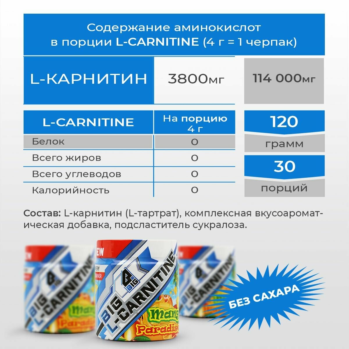 L-карнитин BIGSNT BIG CARNITINE для похудения, снижения веса, повышения выносливости / жиросжигатель / спортивное питание, 120 г, 30 порций, вкус Манго
