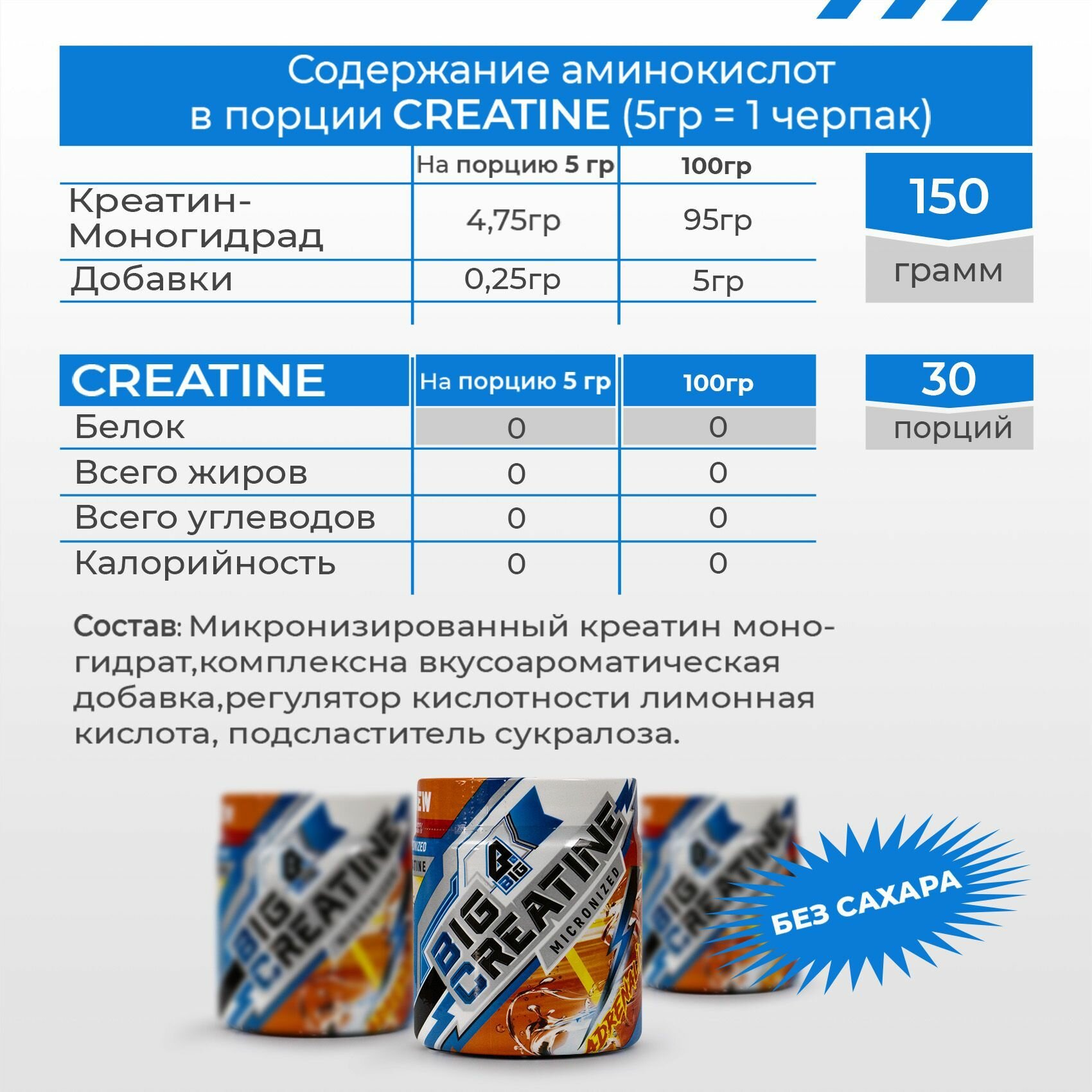 Креатин моногидрат BIGSNT BIG CREATINE для набора мышечной массы, силы и выносливости / спортивное питание, вкус Адреналин, 150 г, 30 порций