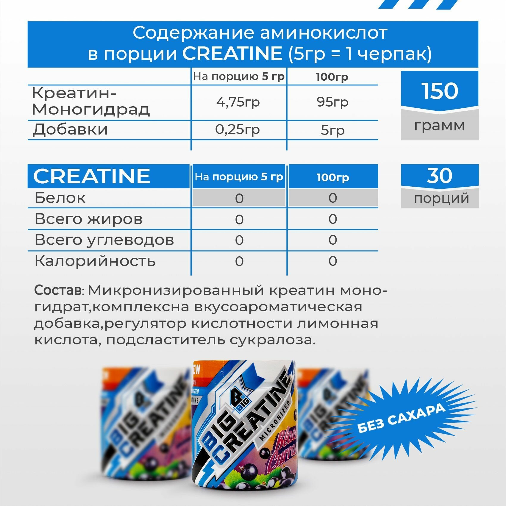 Креатин моногидрат BIGSNT BIG CREATINE для набора мышечной массы, силы и выносливости / спортивное питание, вкус Черная смородина, 150 г, 30 порций