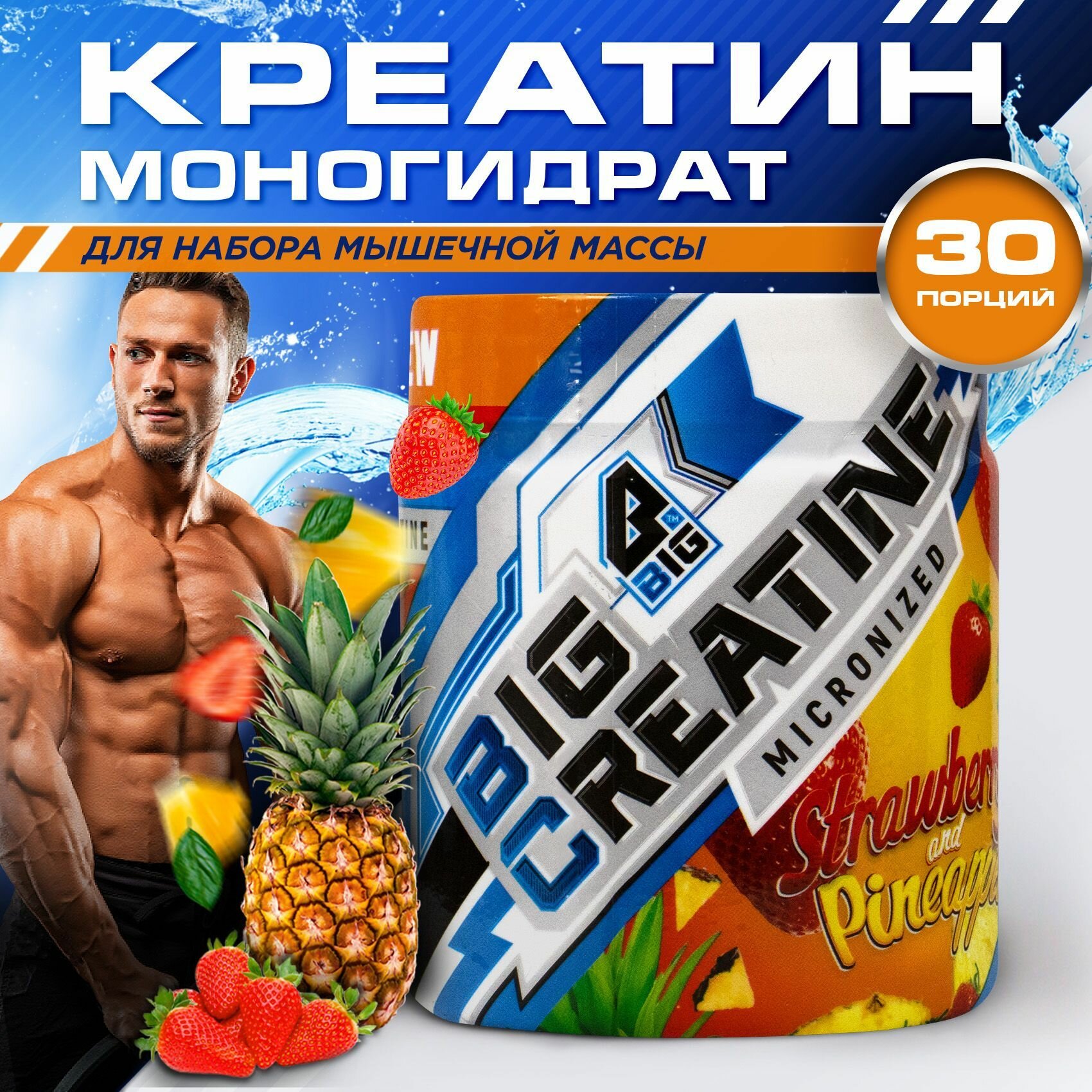 Креатин моногидрат BIGSNT BIG CREATINE для набора мышечной массы, силы и выносливости / спортивное питание, вкус Клубника-Ананас, 150 г, 30 порций