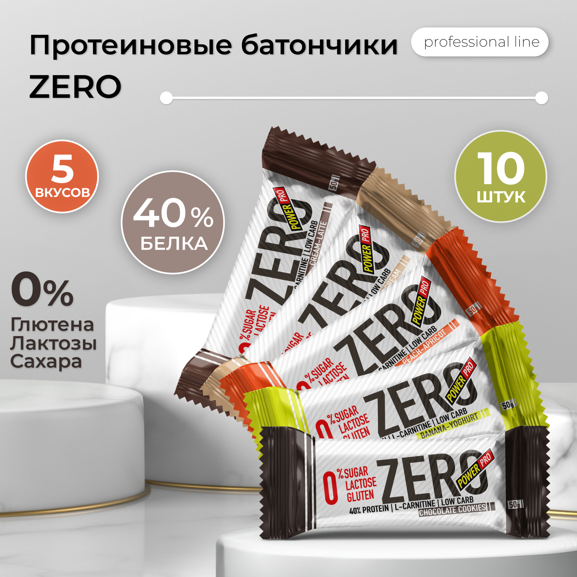 Купить Протеиновые батончики Zero POWER PRO ассорти вкусов: латте, банан, персик-абрикос, ваниль, шоколадное печенье; 10 шт.