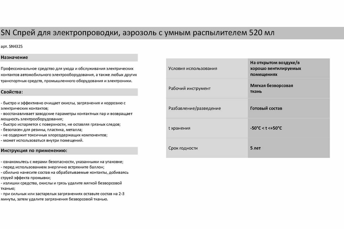 | Способ применения | Перед использованием энергично встряхните баллон в течение 1-2 мин. Обильно нанесите состав на обрабатываемые контакты, добиваясь струей очистителя эффекта промывки. Излишки очистителя, окислы и грязь удалите мягкой безворсовой ветошью. При сильных или застарелых окислах и загрязнениях оставьте состав на 2-3 минуты, затем удалите загрязнения безворсовой ветошью. Благодаря специальному многофункциональному распылителю вы можете обрабатывать обширные площади, нанося состав классическим способом с опущенной трубкой, а также обрабатывать труднодоступные места или наносить точечно, подняв для этого трубку. |